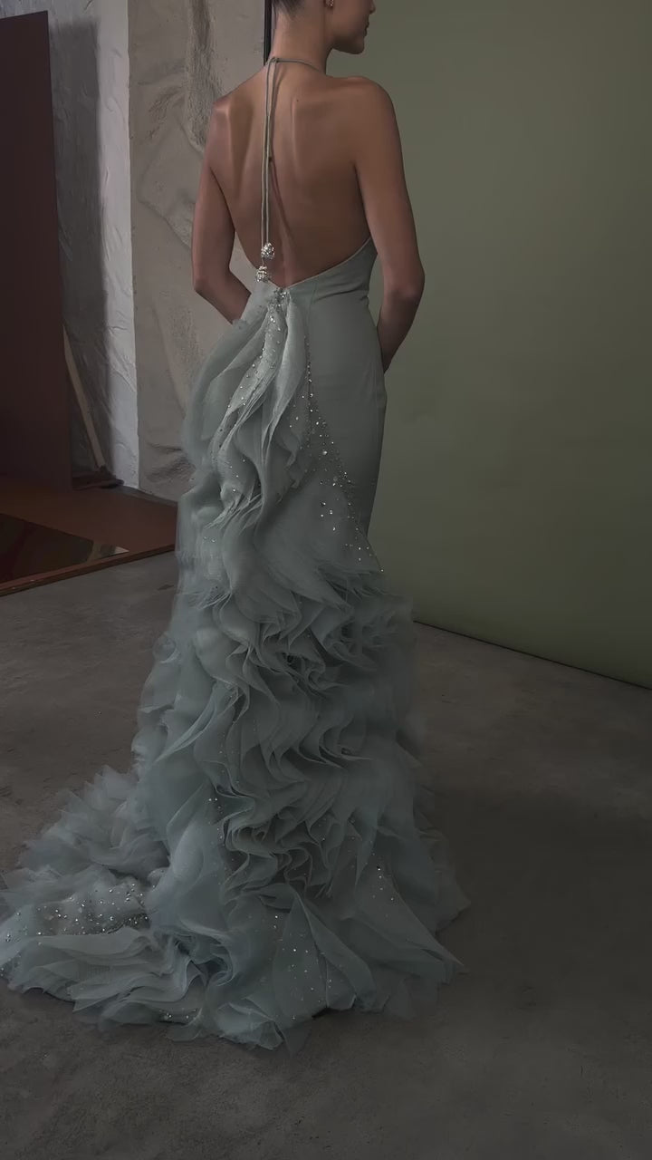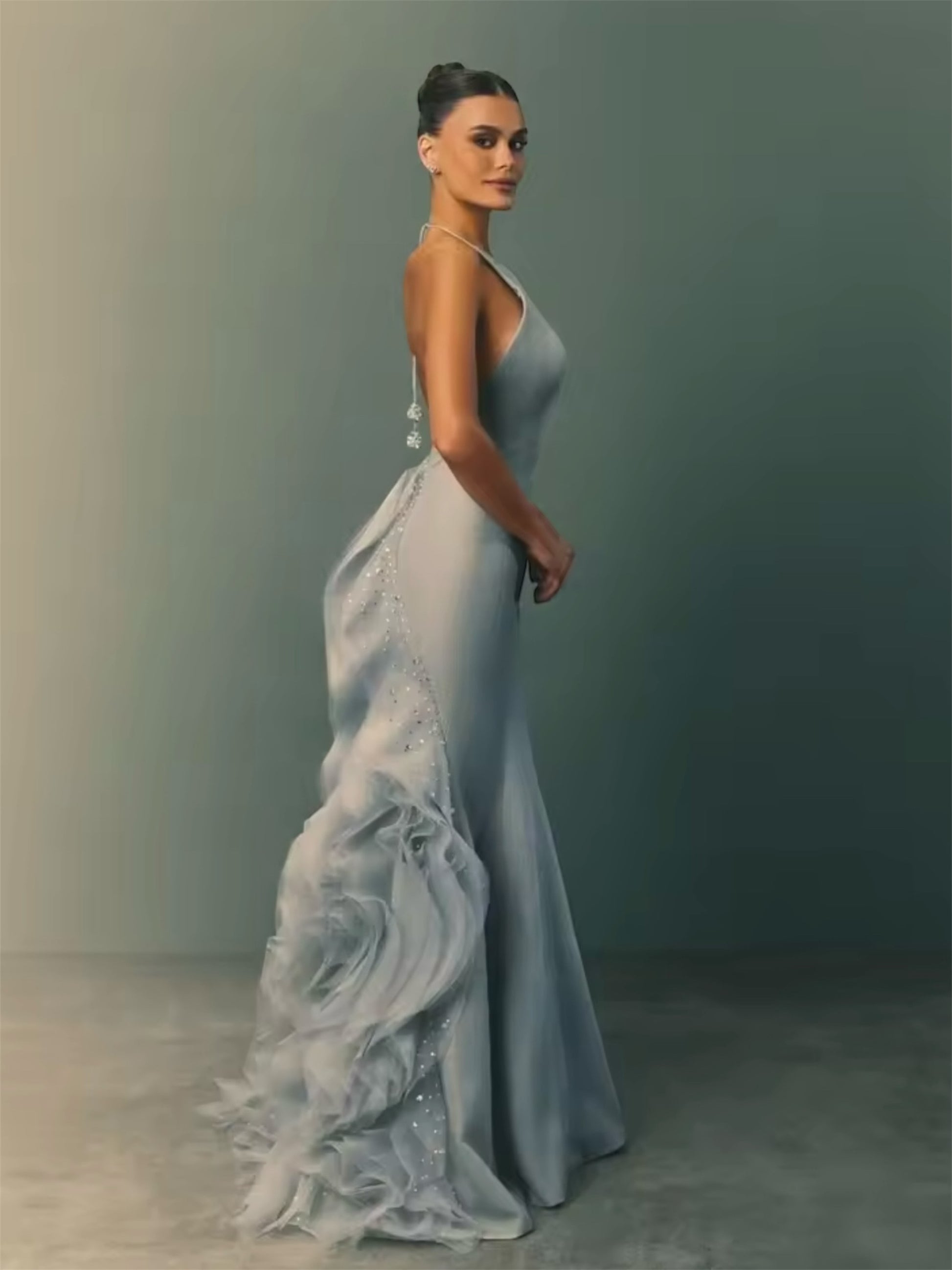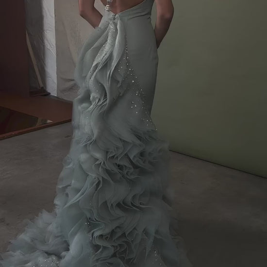 Malika whispers of grace in the softest light blue, like morning skies over calm waters. This gown features delicate ruching across the bodice, gently embracing the waist before falling into a fluid, floor length skirt. The subtle drape over the shoulders gives it a graceful, almost regal softness. The kind of beauty that speaks without ever raising its voice.