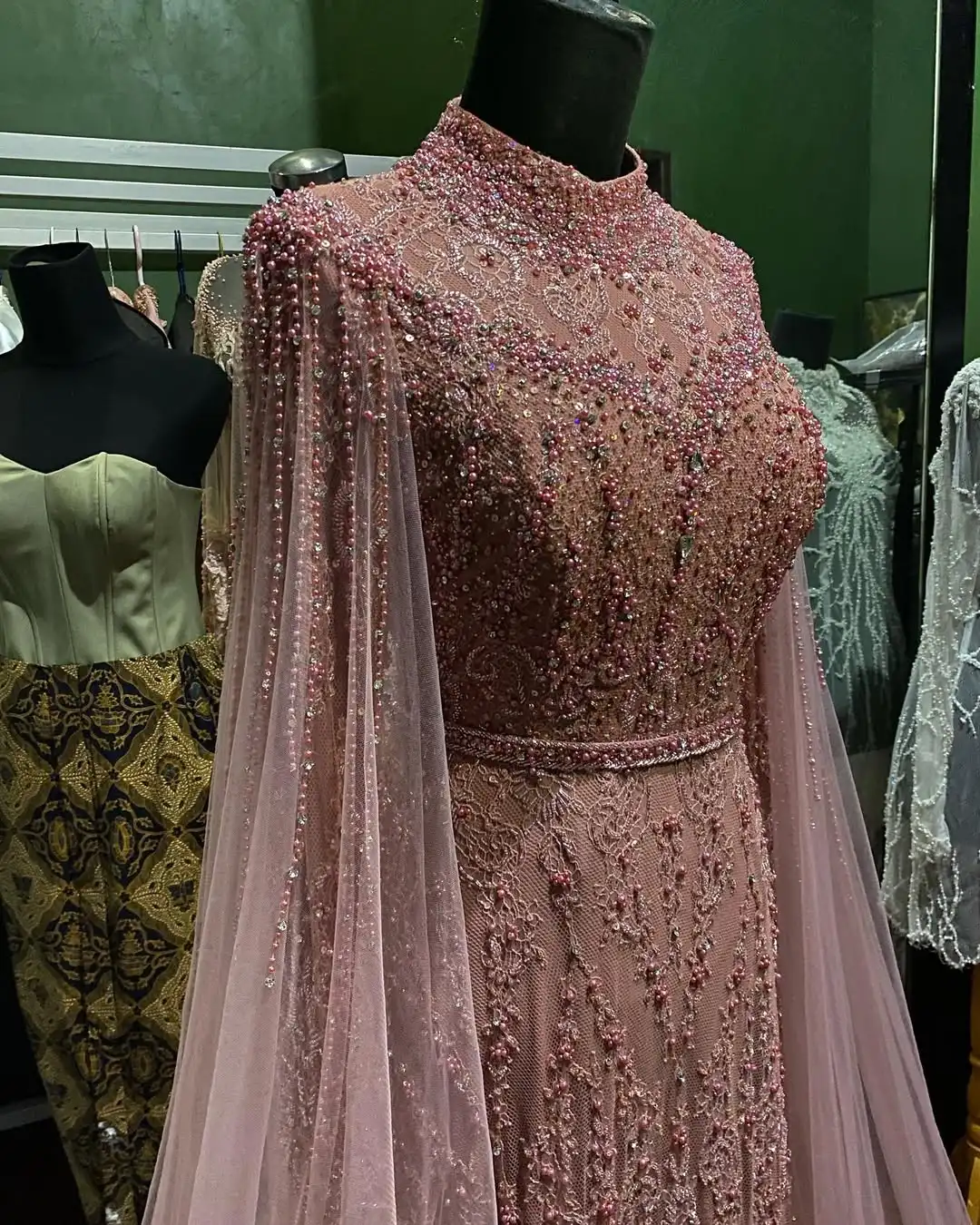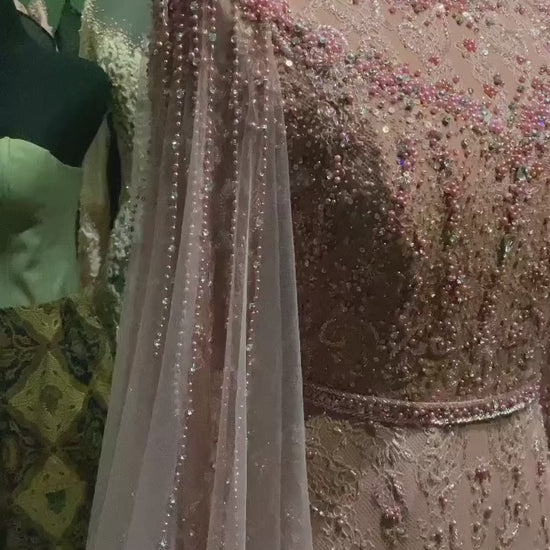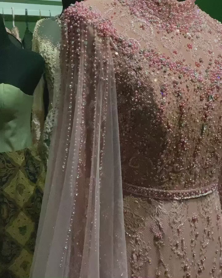 Zayna gown is pure elegance. Crafted in a rose hue, it features intricate beadwork that shimmers with every movement. The neckline and flowing cape sleeves add a regal touch, while the fitted silhouette offers timeless charm.