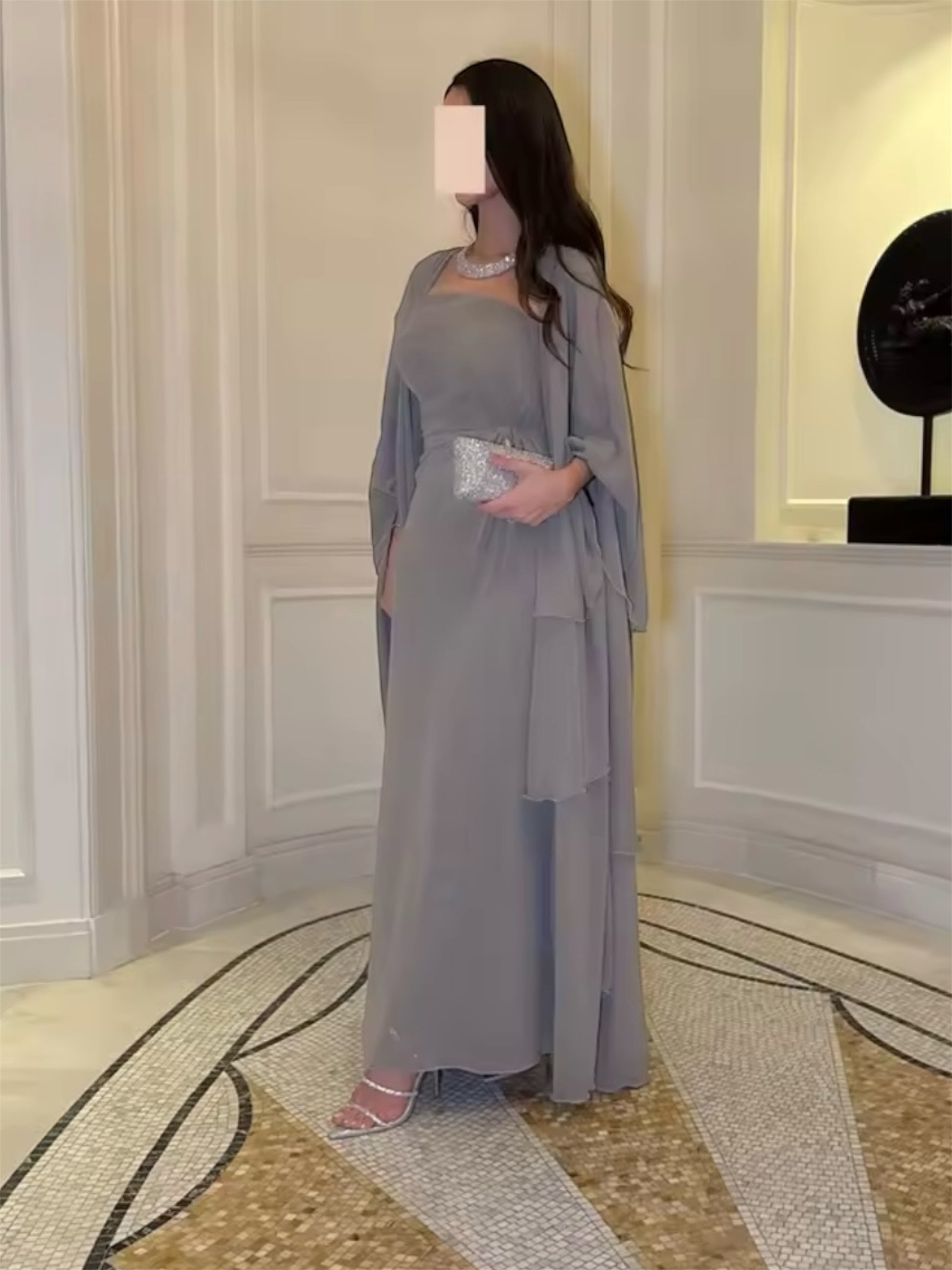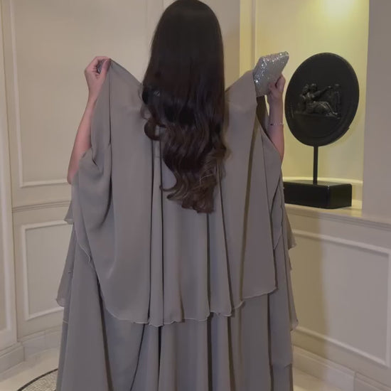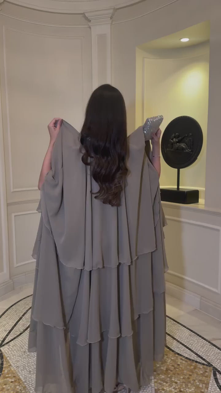 Huda is a flowing dove-grey gown that offers understated luxury, with cascading layers of chiffon that move like poetry. The matching draped cape provides both coverage and drama, making it ideal for those who want sophistication without satisfying comfort.