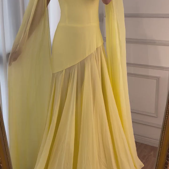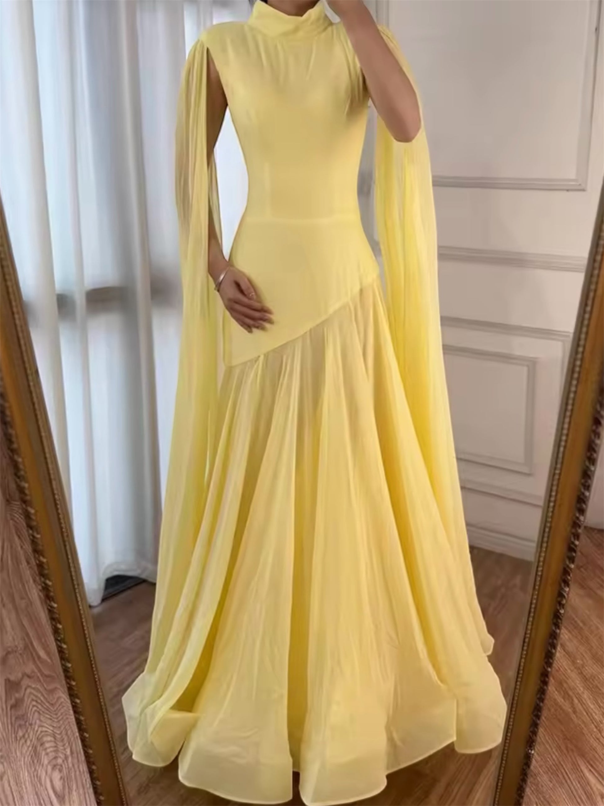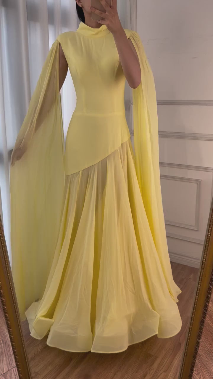 Aurelia is a dreamy sunlit gown that radiates effortless elegance. Crafted from layers of soft chiffon, it drapes fluidly into a luminous skirt with graceful flow at every step. The high neckline balances the dramatic flair of the gown, while the attached cape sleeves cascade down like liquid silk, adding a regal presence.