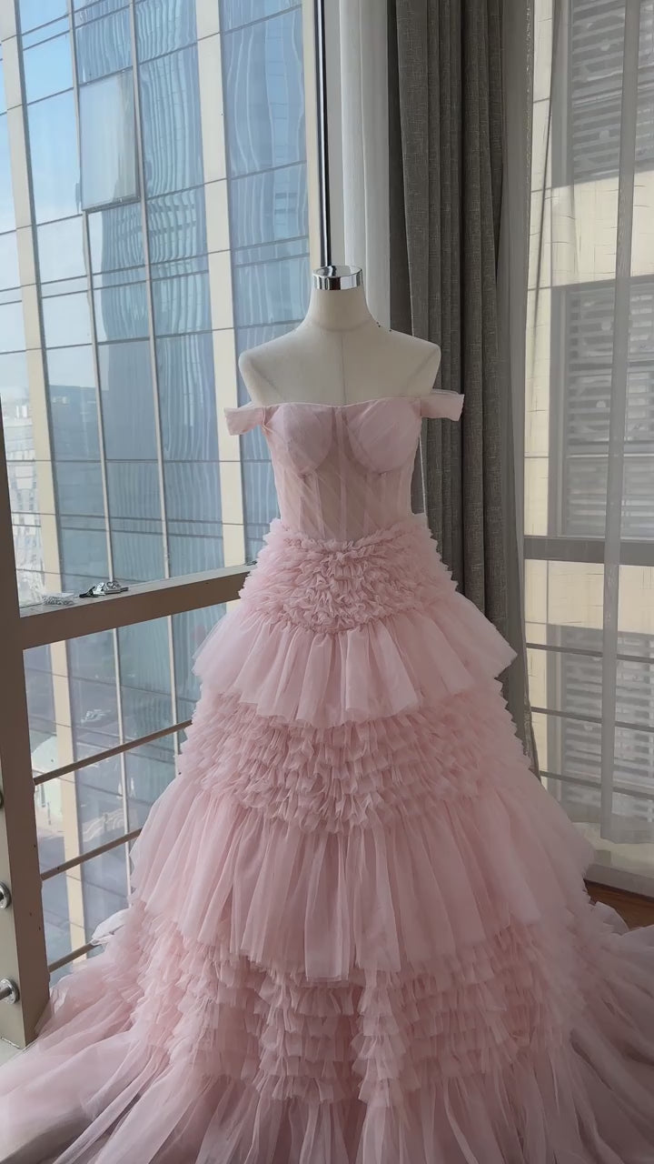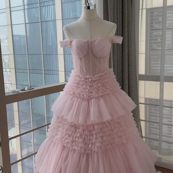 Lumira gown is an ethereal vision in layers of dusty rose tulle, captivating a romantic silhouette that floats between dream and drama. The gown features a delicately boned corset bodice with an off-shoulder neckline that softly embraces the collarbone, flowing into an opulent skirt of cascading ruffles and pleated tiers. Each fold and gather whispers of old-world couture, while the corset's lace-up back adds a sensuous, modern detail. Perfect for the muse who wants to enchant without saying a word.