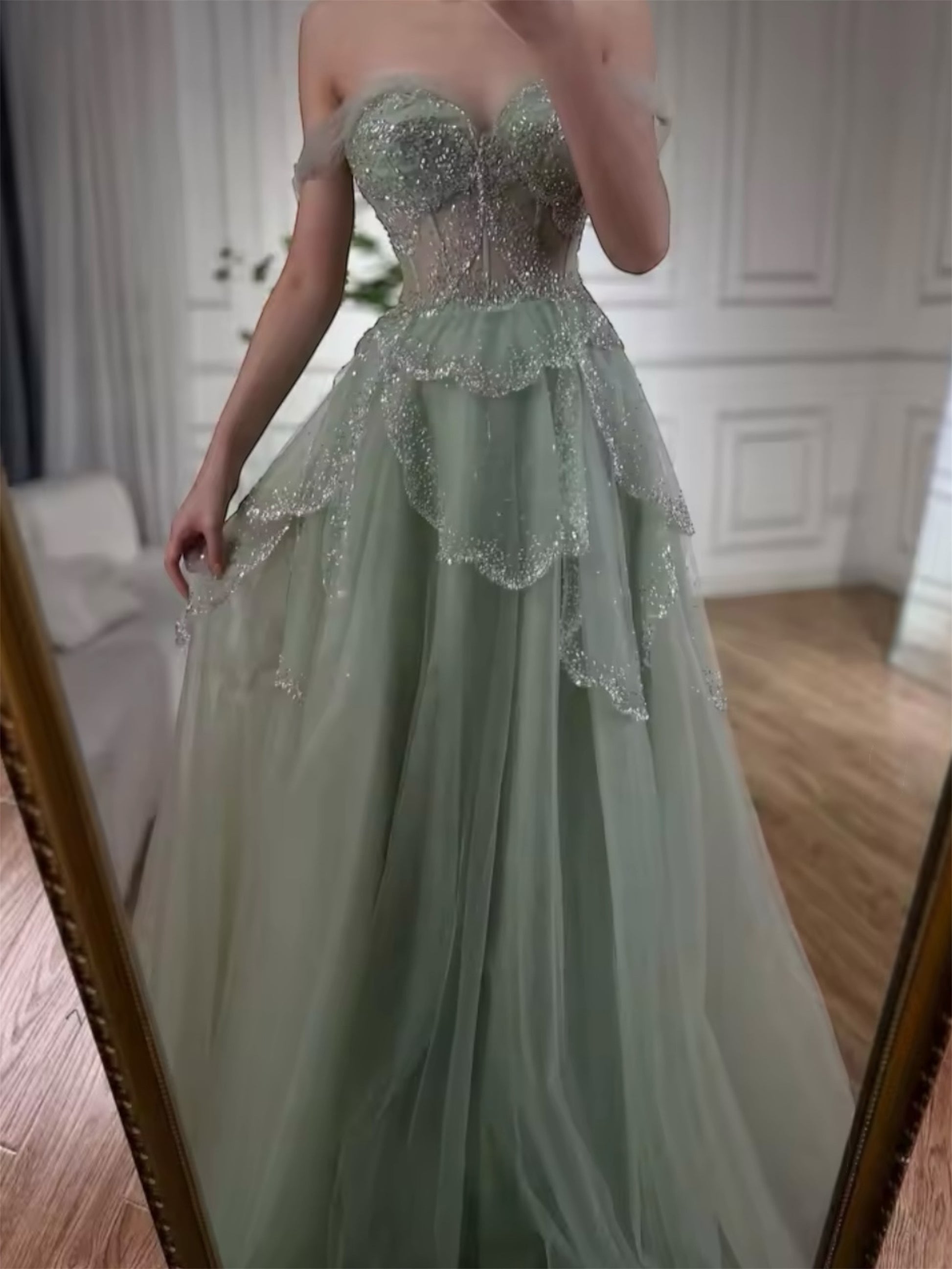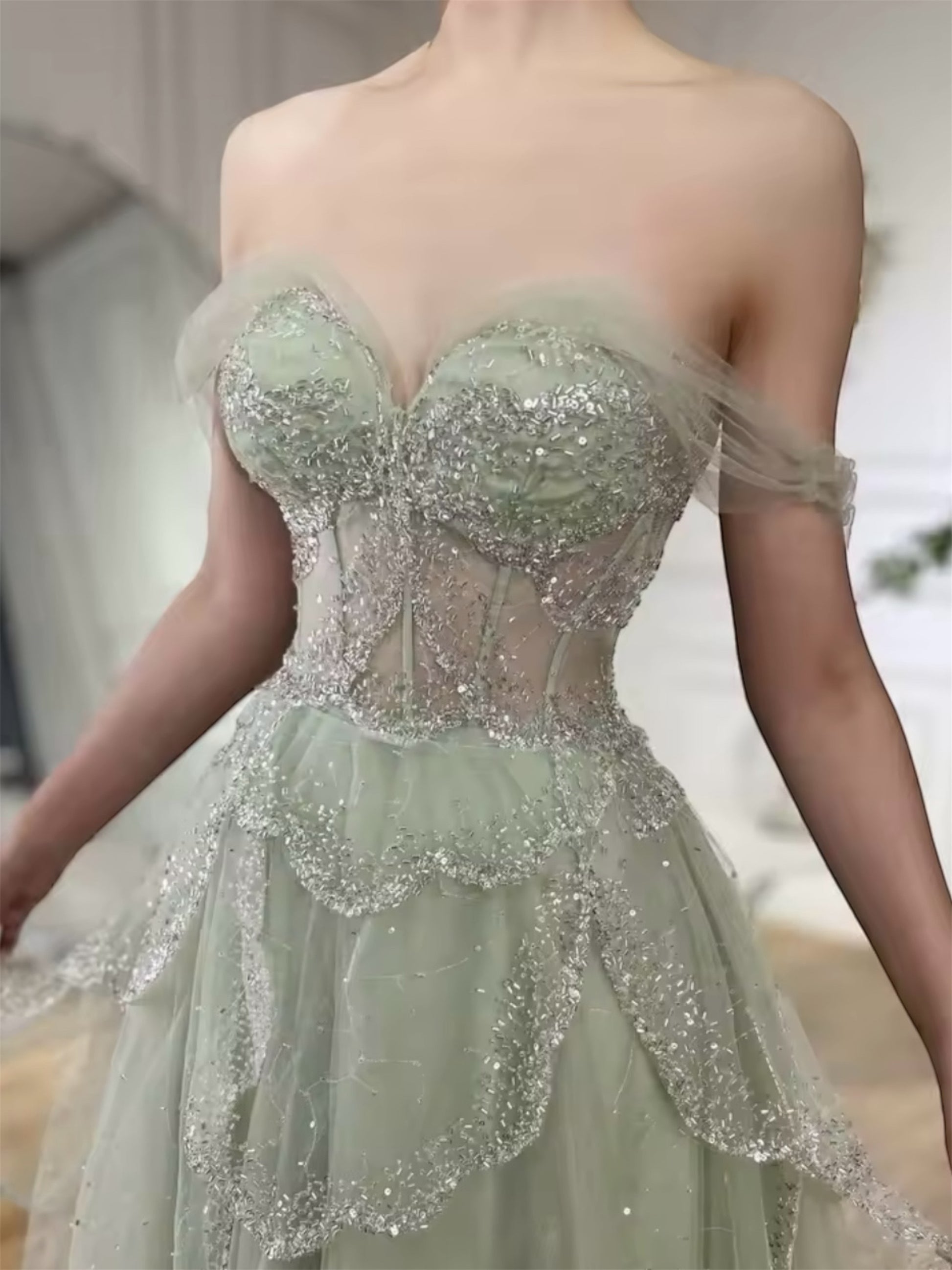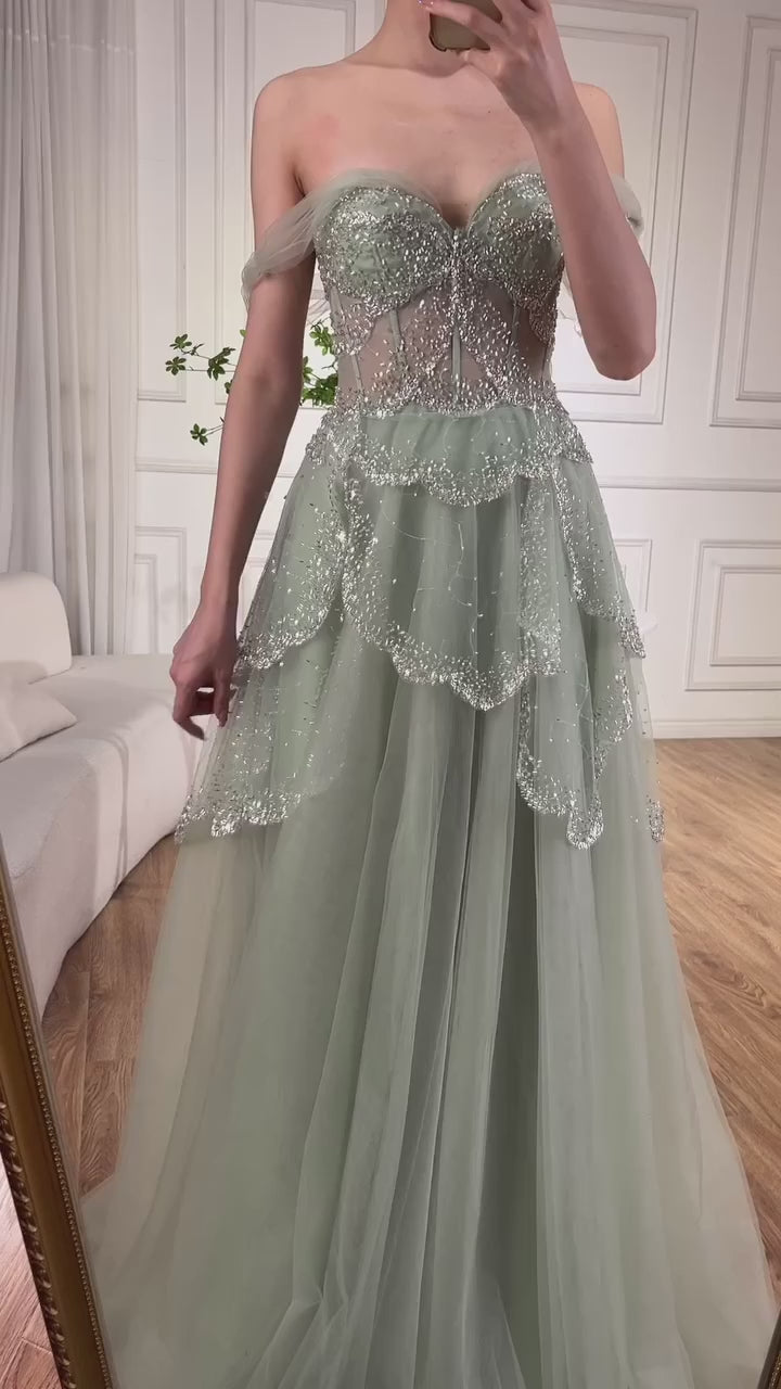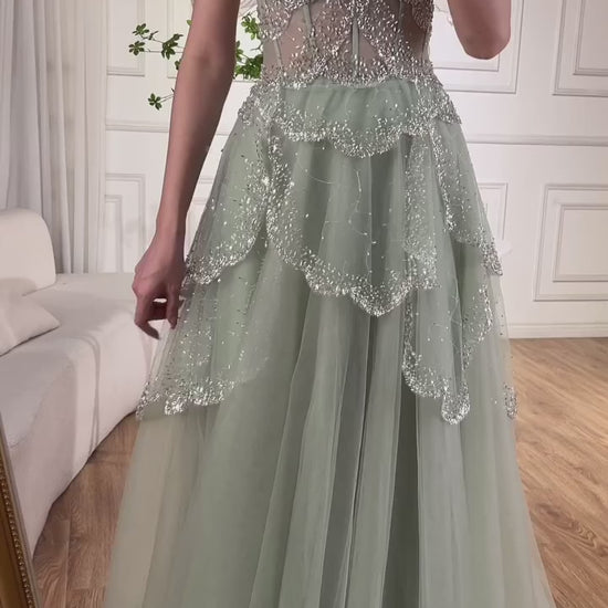 Mia gown features a structured corset bodice that beautifully sculpts the waist and enhances the silhouette. The delicate silver embellishments cascade over soft tired layers, adding depth and elegance. The back is finished with a classic lace-up corset, offering an adjustable, flattering fit for every body type.