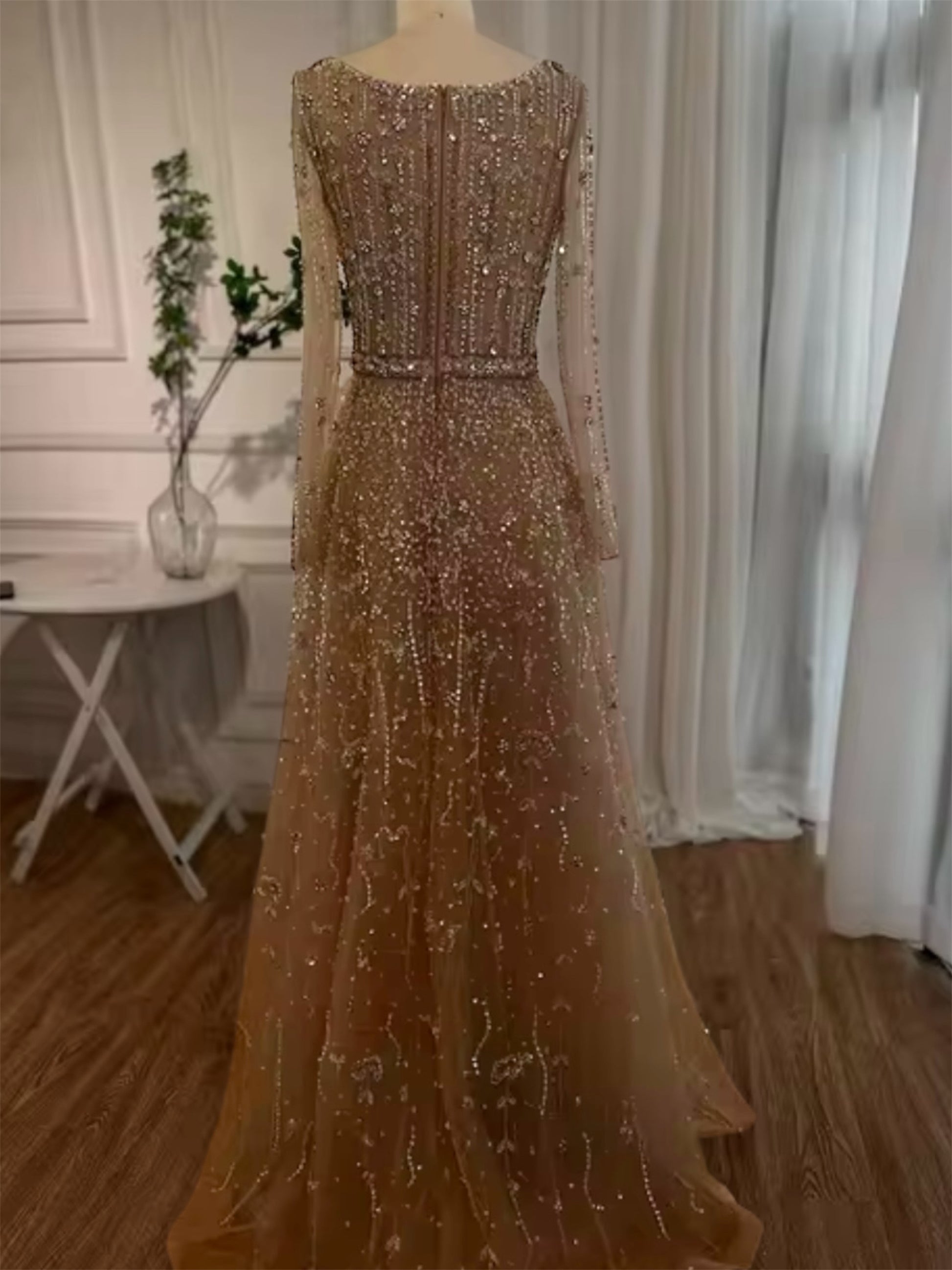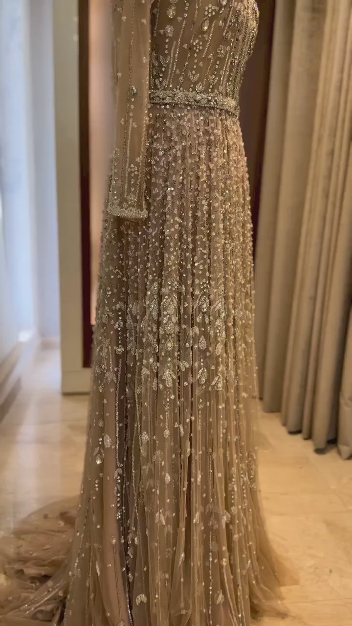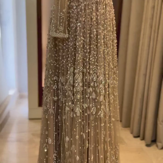 Norah gown is a vision of timeless sophistication. A masterwork of intricate beadwork and delicate embroidery, cascading in shimmering streams of embellishments. Norah is perfect for the woman who walks into a room and owns it.