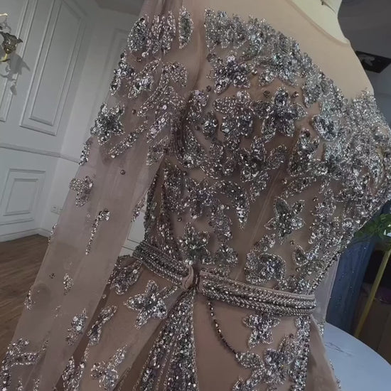 Bridgette gown is a stunning illusion gown that makes an unforgettable entrance. Adorned with intricate silver beadwork and hand-placed crystals. The sheer sleeves and sculpted bodice flow into a graceful skirt, catching the light with every step. Elegant, regal, and timeless. This is the gown for the woman who knows she is the moment.