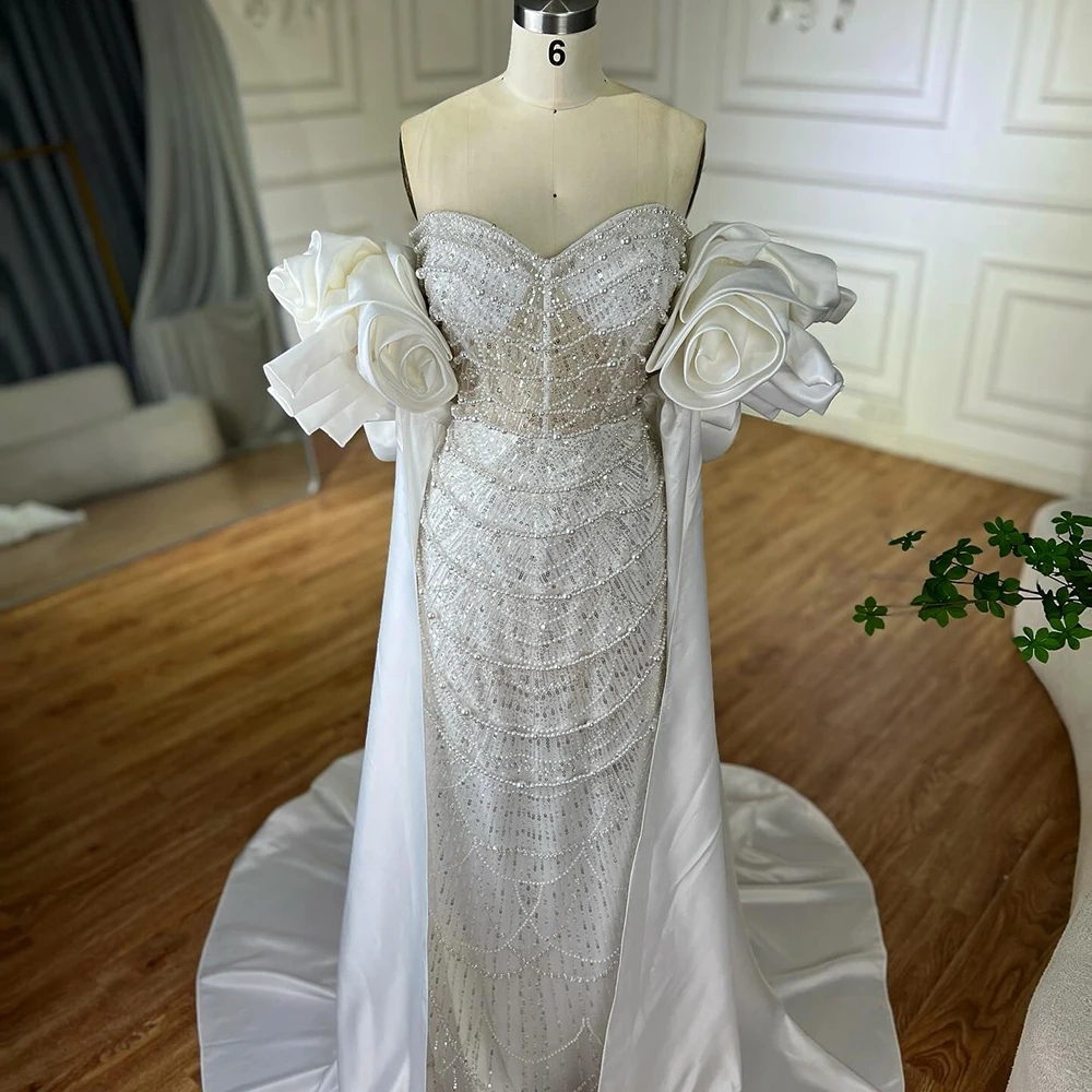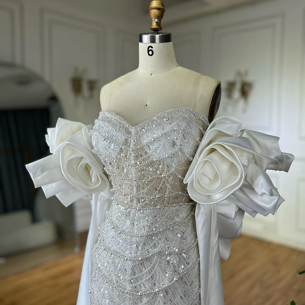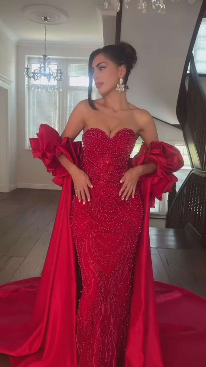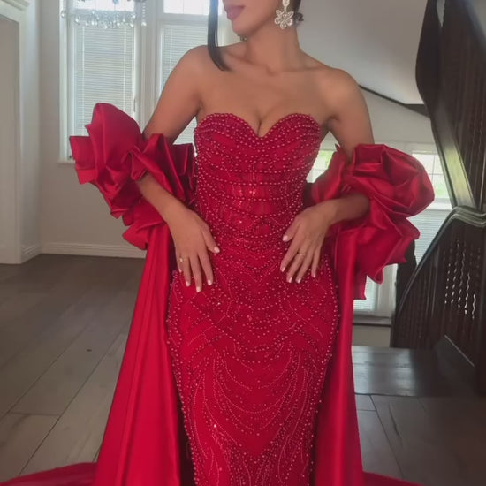 Matilda gown - Turn heads in this fiery red masterpiece where bold meets elegance. Drenched in sparkling detail and crowned with dramatic rose sleeves, this gown transforms effortlessly. Wear it with the voluminous train for a show stopping entrance, or go sleek and strapless for a sultry, refined look. One dress, endless allure.