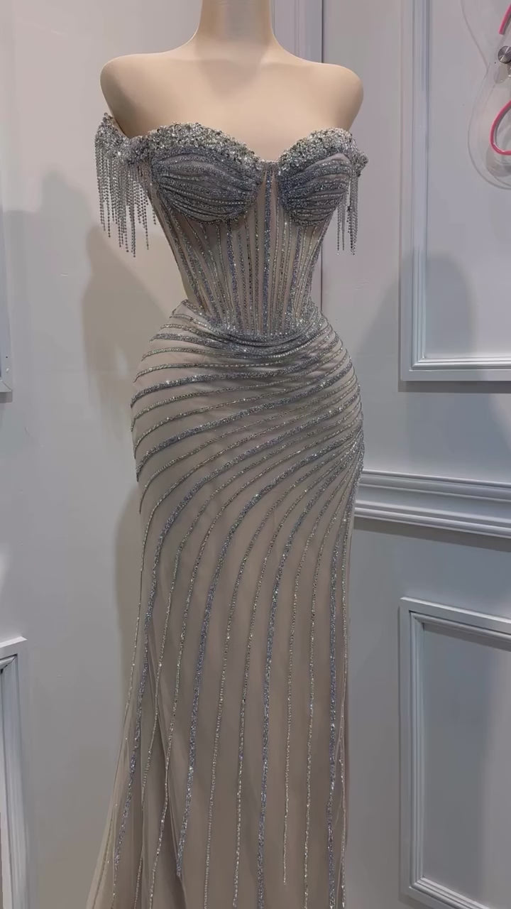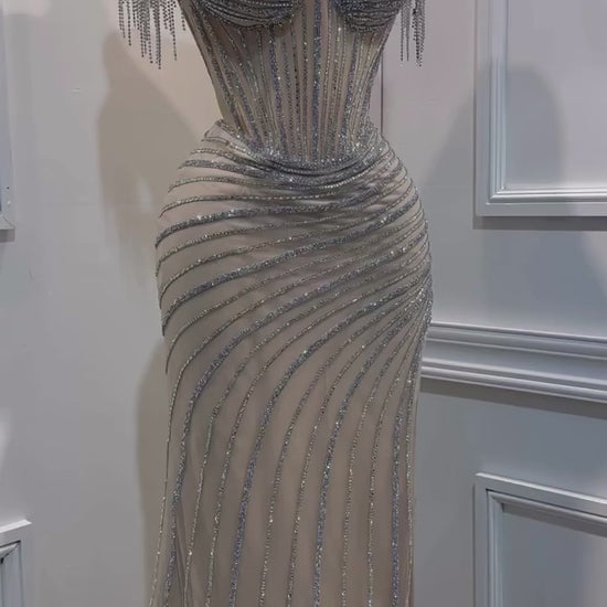 Gemma gown turn heads with its silver beaded off-shoulder style, crafted to sculpt and dazzle. The corset-style bodice cinches at the waist and lifts the silhouette with a structured sweetheart neckline, adorned in sparkling embellishments and delicate fringe. Shimmering lines flow down the sheer nude base, creating an hourglass illusion that moves with grace. The soft train completes the look with ethereal charm.