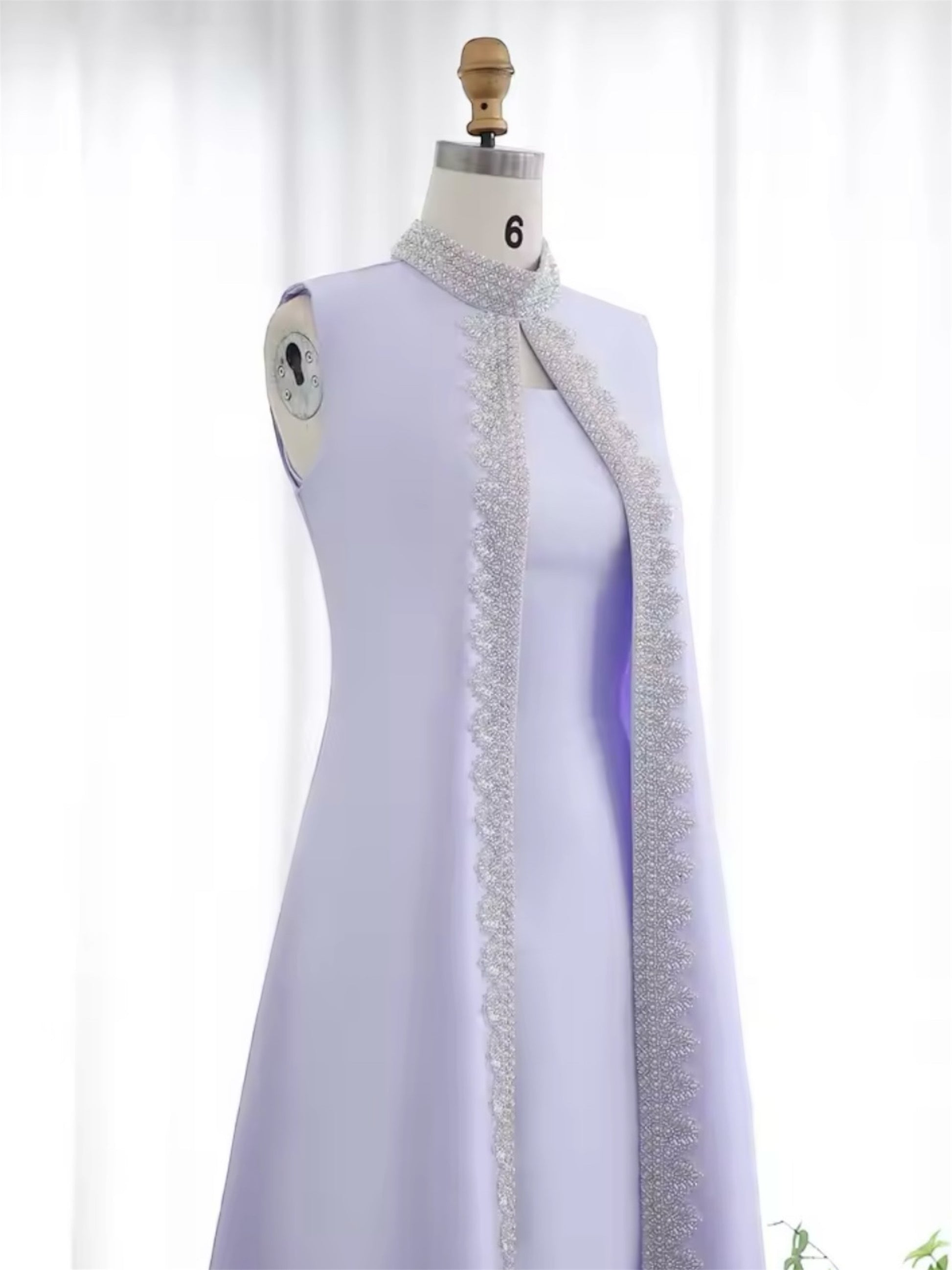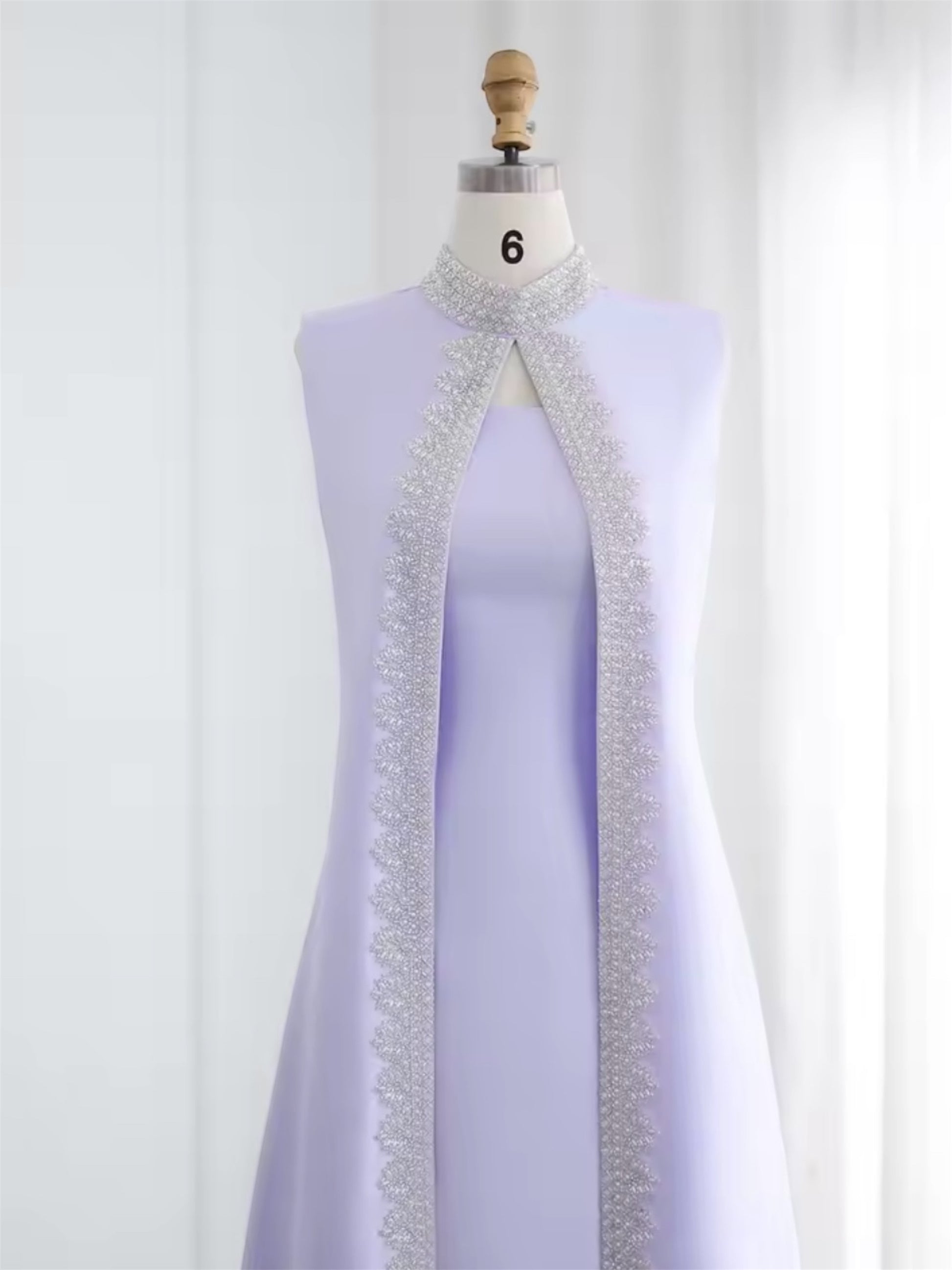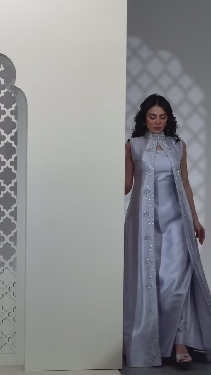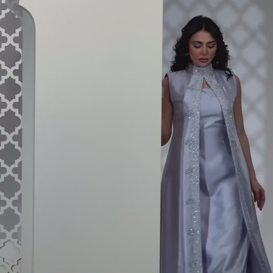 Jasmine is an elegant sleeveless gown crafted in shimmering satin texture, designed with a straight A line silhouette that flows gracefully to the floor. The look is elevated by a statement front overlay panel, lined with intricate beadwork and embroidery, creating a regal, elongated effect.