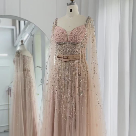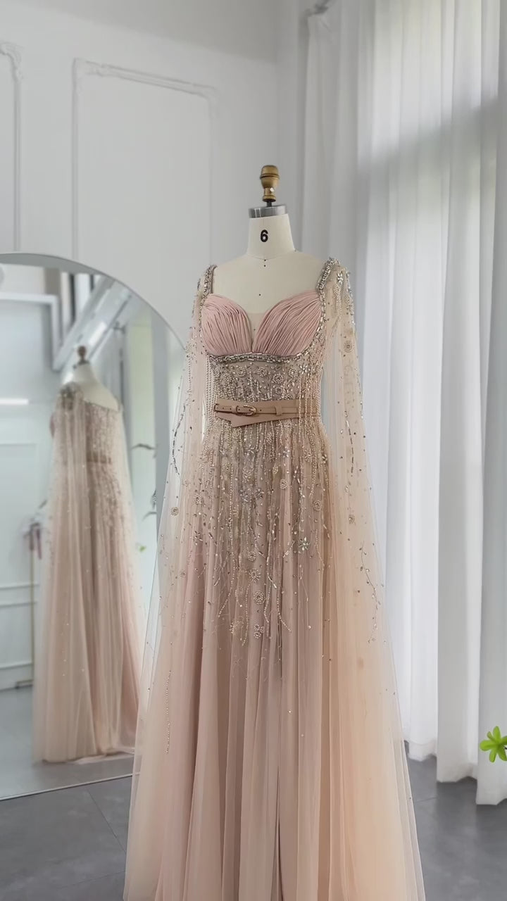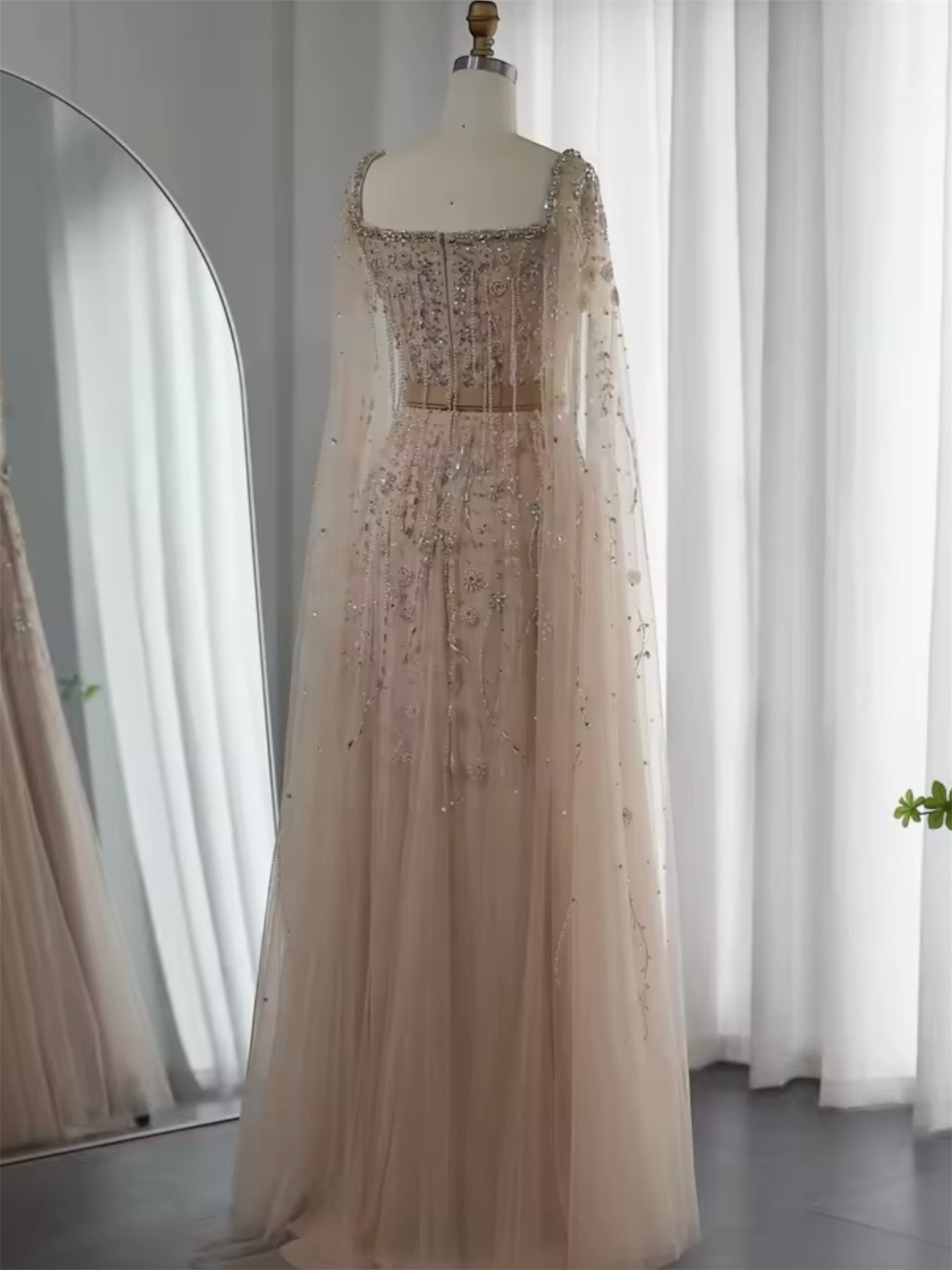 Isra captivates with daring elegance, featuring a fitted bodice adorned with intricate beadwork and a flowing cape that glides with every step. The plunging neckline and high slit reveal a confident silhouette, while soft pleats and shimmering embellishments evoke the allure of starlit nights. This gown is a perfect harmony of strength and seduction.