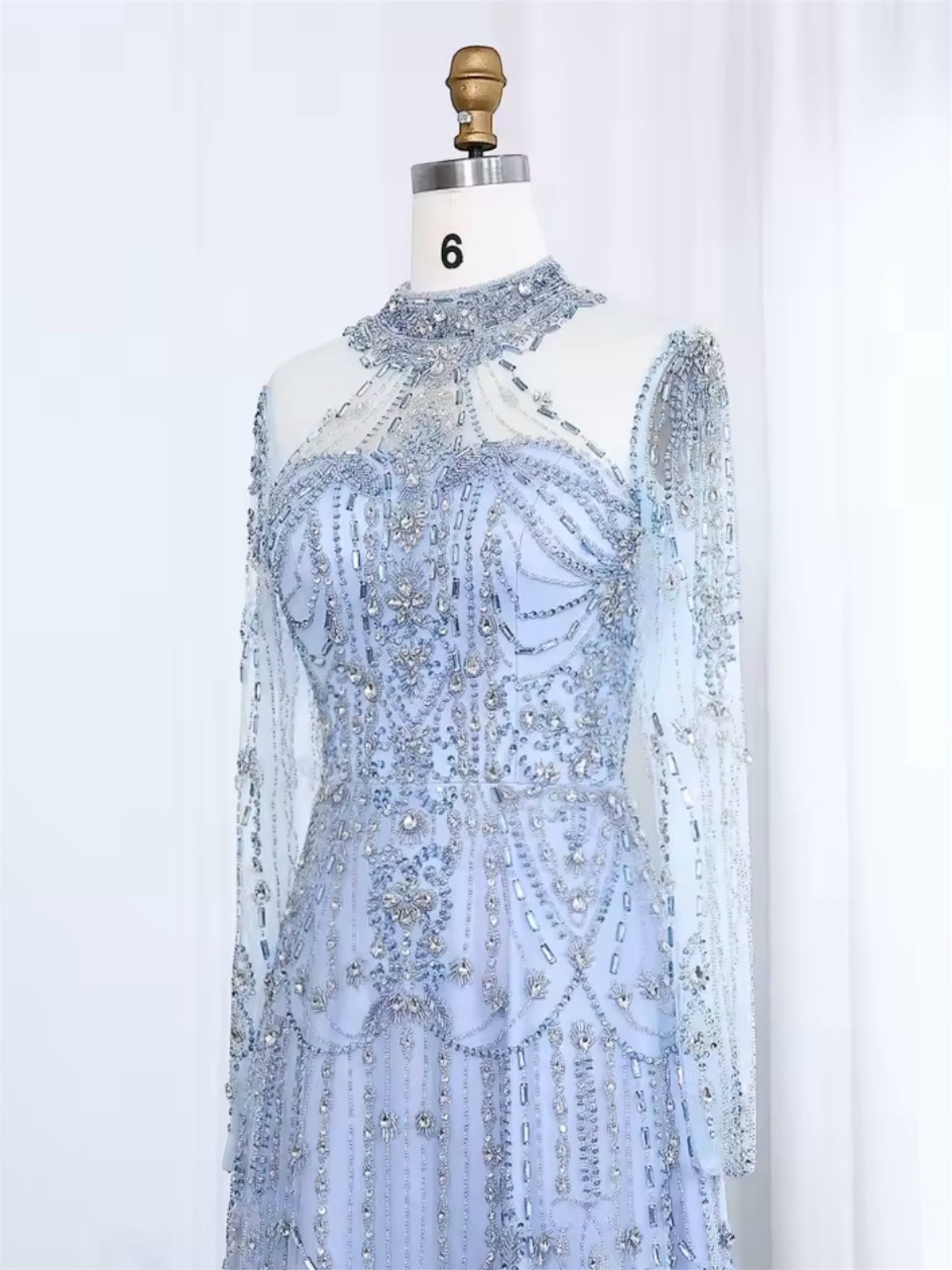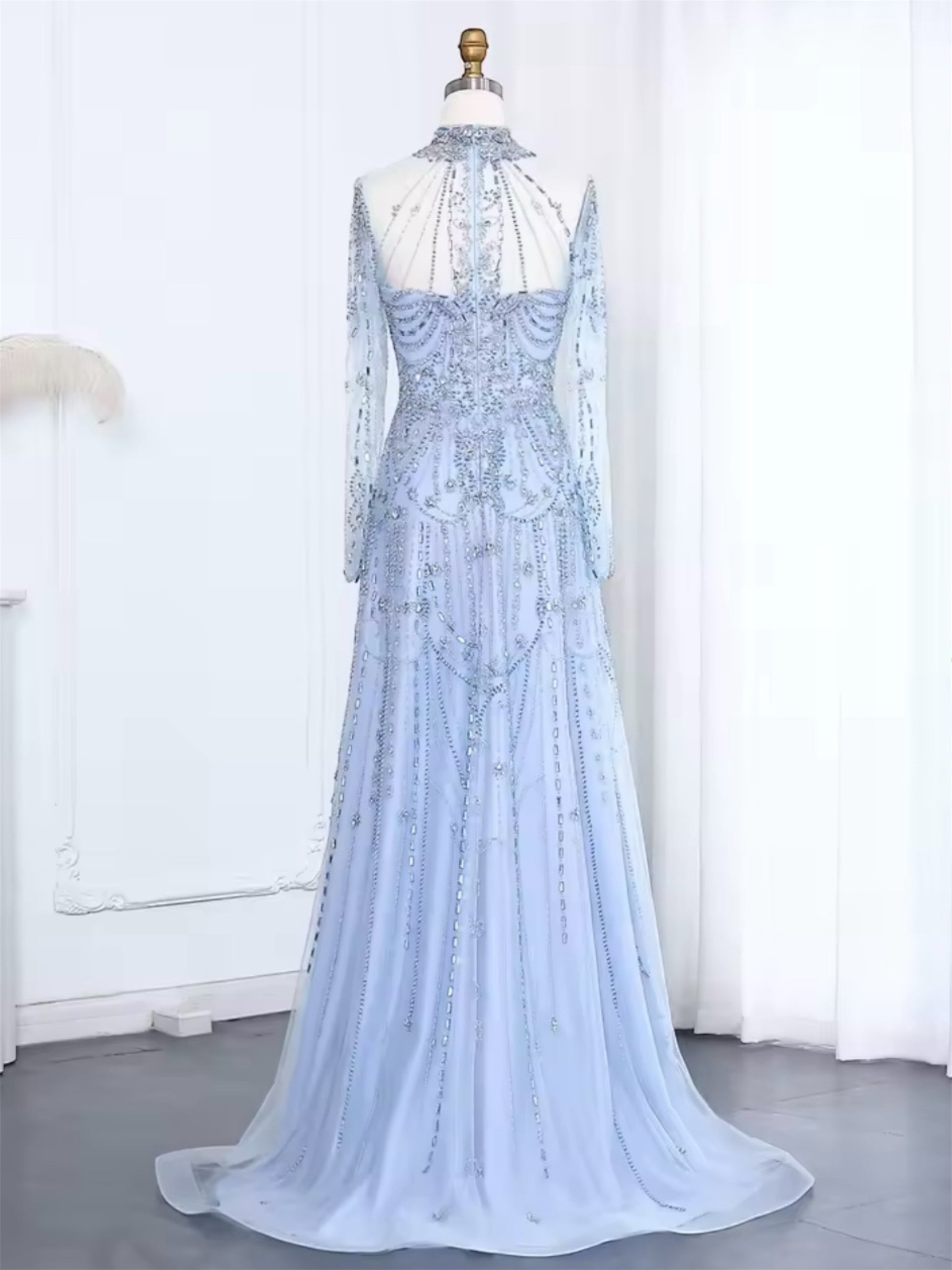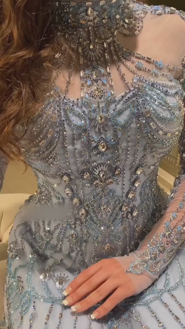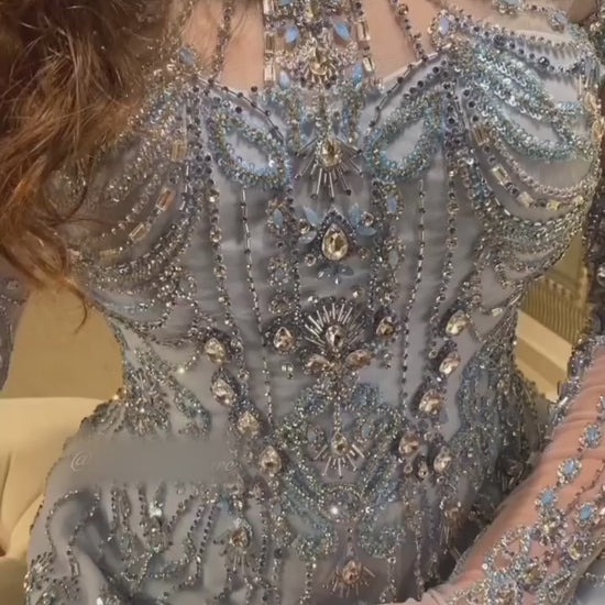 Elise gown is a breathtaking gown, a poetic masterpiece in tulle and intricate beadwork. The high illusion neckline paired with cascading crystal embellishments evokes a regal air, while the subtle sheerness of the sleeves adds a whisper of seduction. The way the dress hugs the torso and then floats to the floor with effortless grace ensures an ethereal silhouette. With every step, the shimmer of the embellishments catches the light, making this gown a true showstopper.