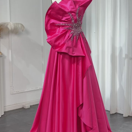 Command attention in this bold fuchsia Catalina gown designed to make a statement. The standout feature is the oversized sculpted ruffle on the bodice, shaped like a dramatic floral bloom, detailed with intricate hand-embellished crystals in a star-bust pattern. The front slit adds a modern, confident touch, while the rich satin finish enhances the structure. This dress is for the woman who owns the room.