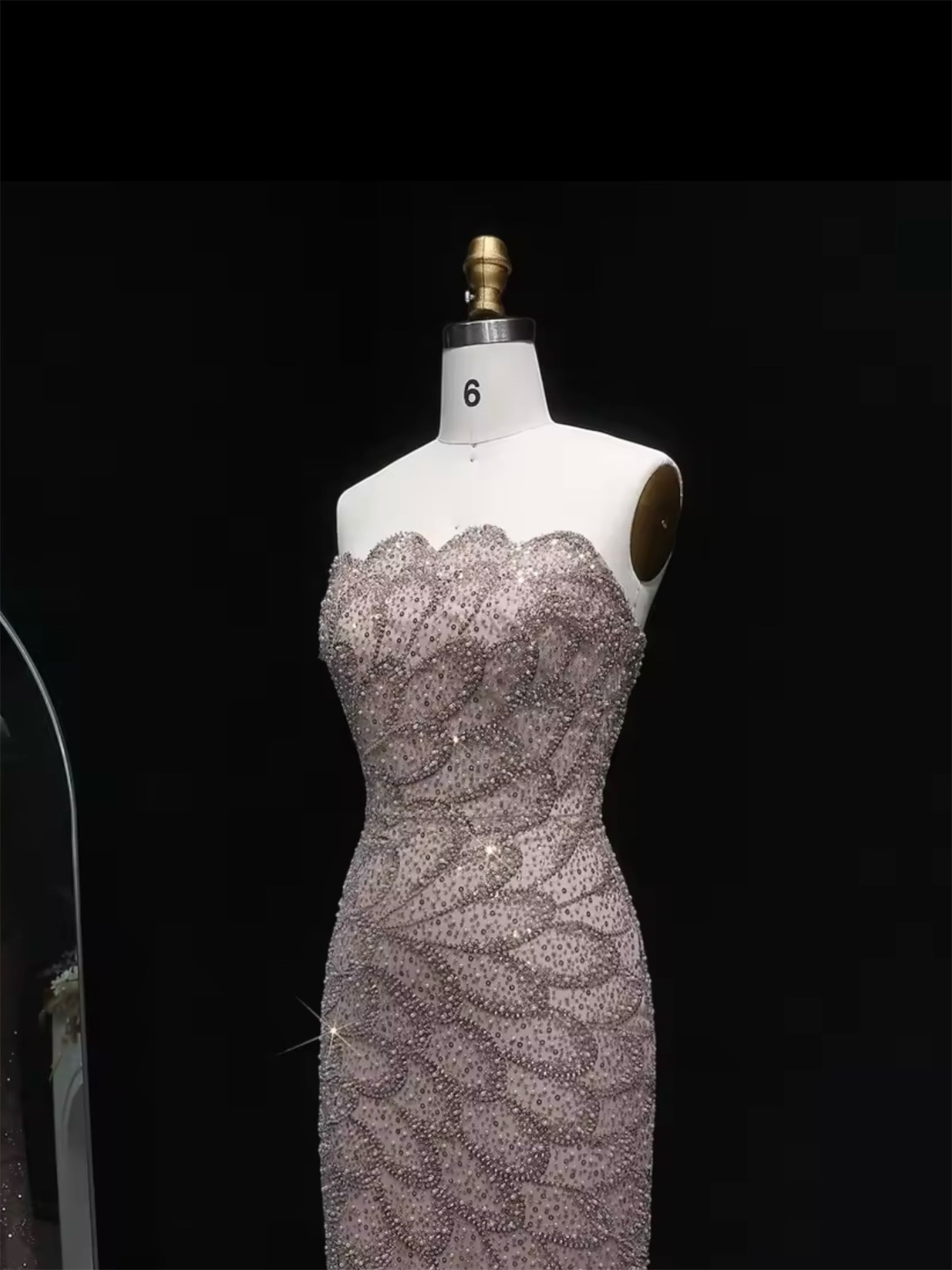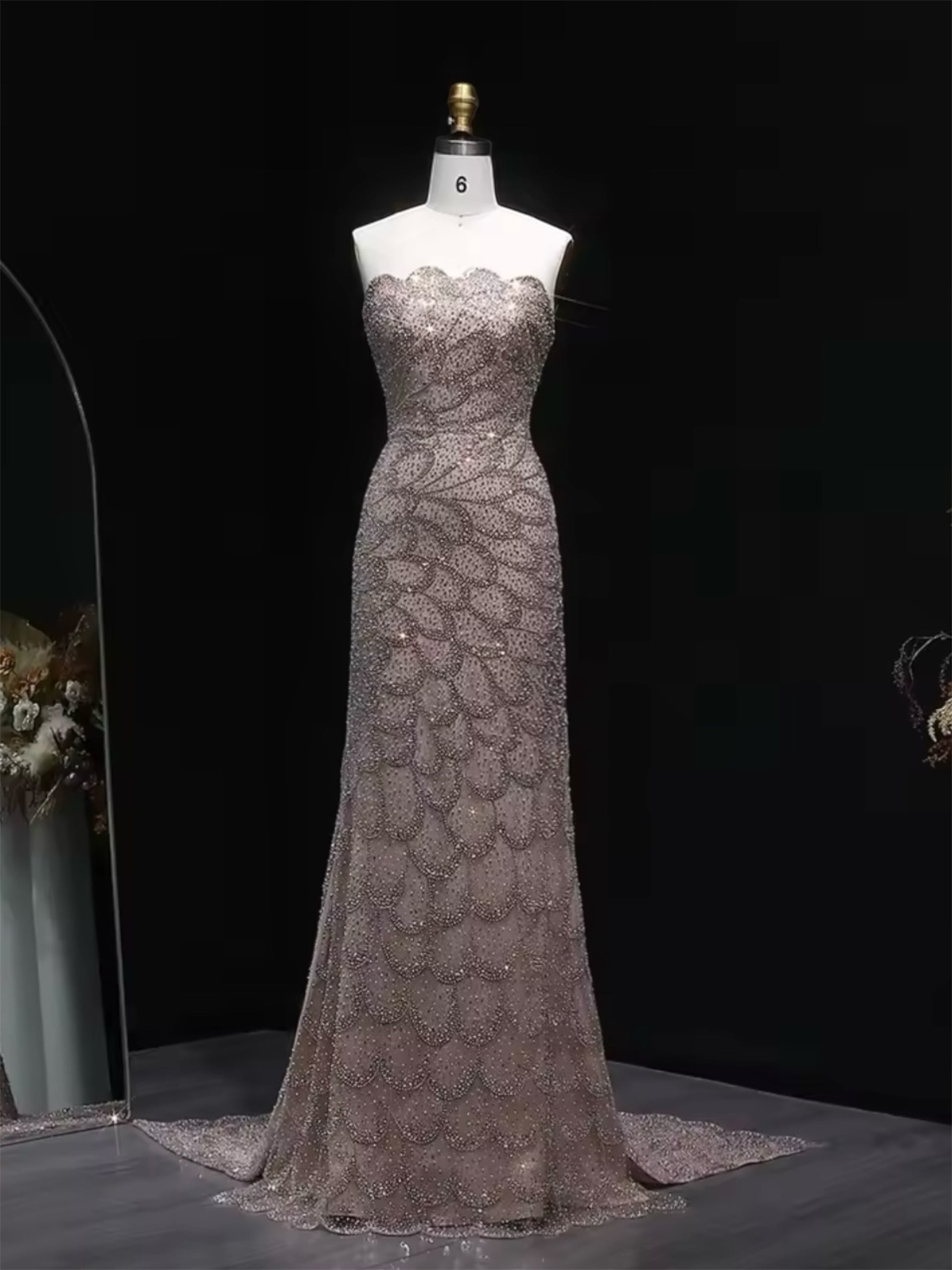 Dahlia gown is designed to sculpt and celebrate your figure, this strapless gown glistens with wave like sequin patterns and a dramatic mermaid silhouette. It's bold, sensual, and made for a woman who commands attention effortlessly.
