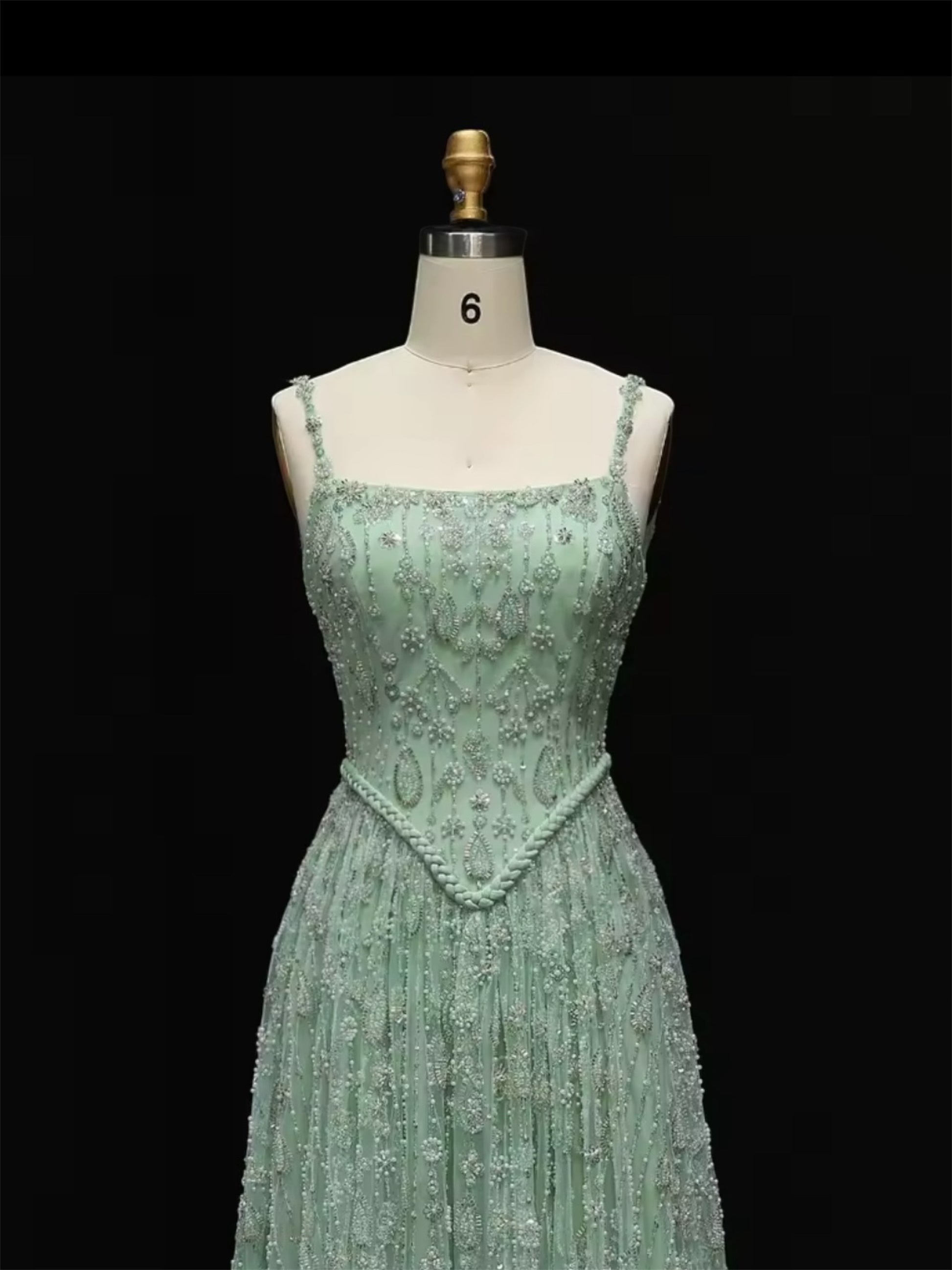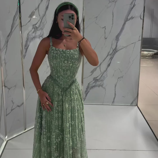 Step into a fairytale with this dreamy mint Emmaline gown, delicately hand-beaded with shimmering crystals that catch every glimmer of light. The fitted bodice melts into a flowing skirt, draped with floral embroidery that flatters every curve. Feminine, graceful, and ethereal, this dress whispers elegance while making you the star of every room.