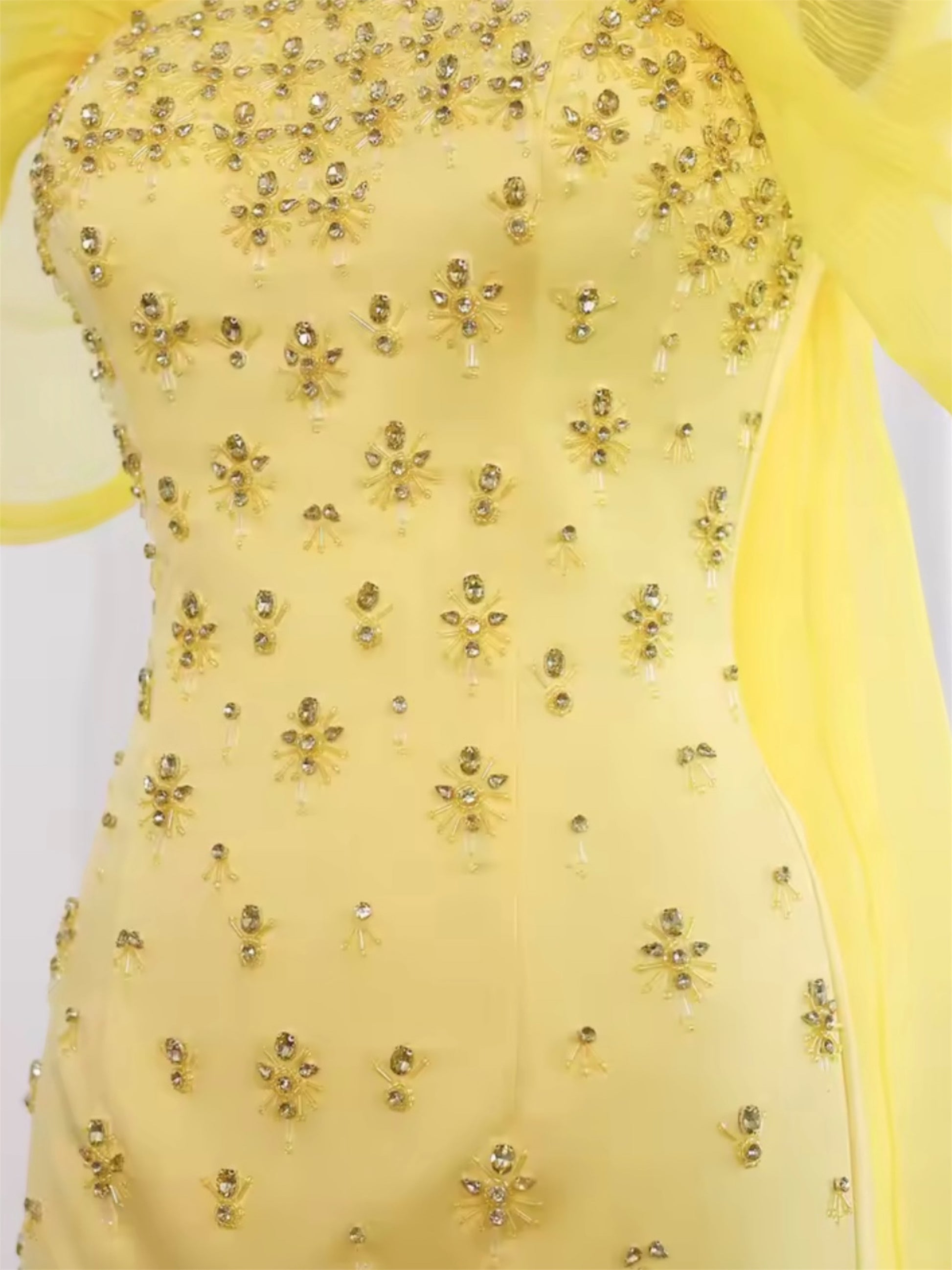 Ava, a radiant statement piece, this sunshine yellow gown features delicate hand applied embellishments that glisten with every movement. The structured bodice is framed by dramatic organza puff sleeves that flow into ethereal drapes, creating a regal silhouette. Bold yet feminine, it's the perfect choice for those who want to stand out with grace and confidence.