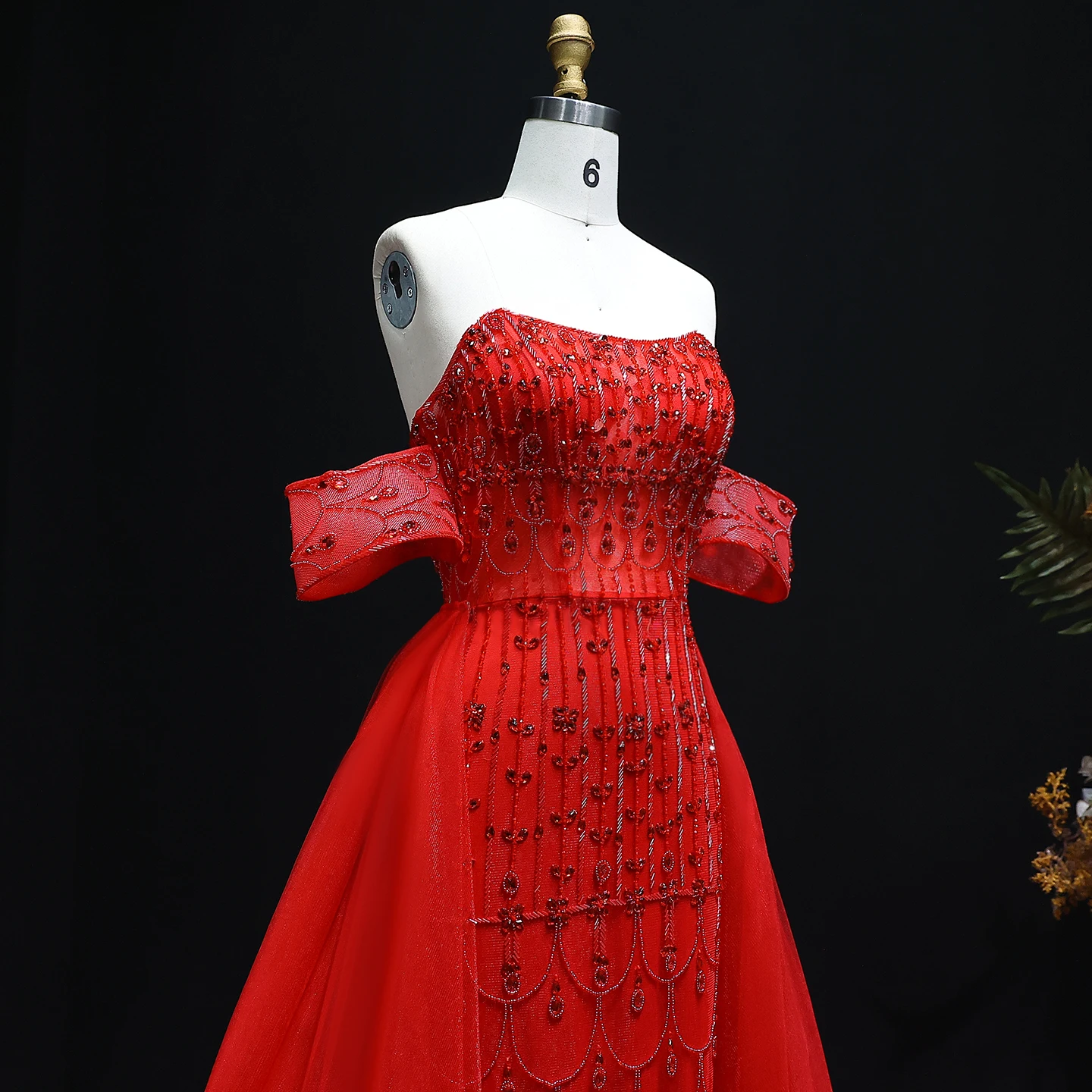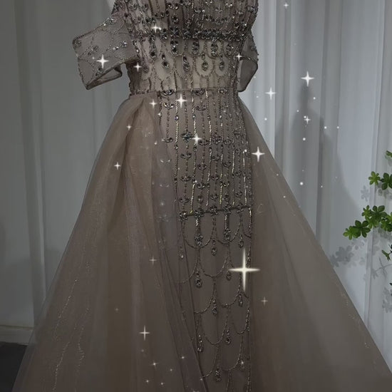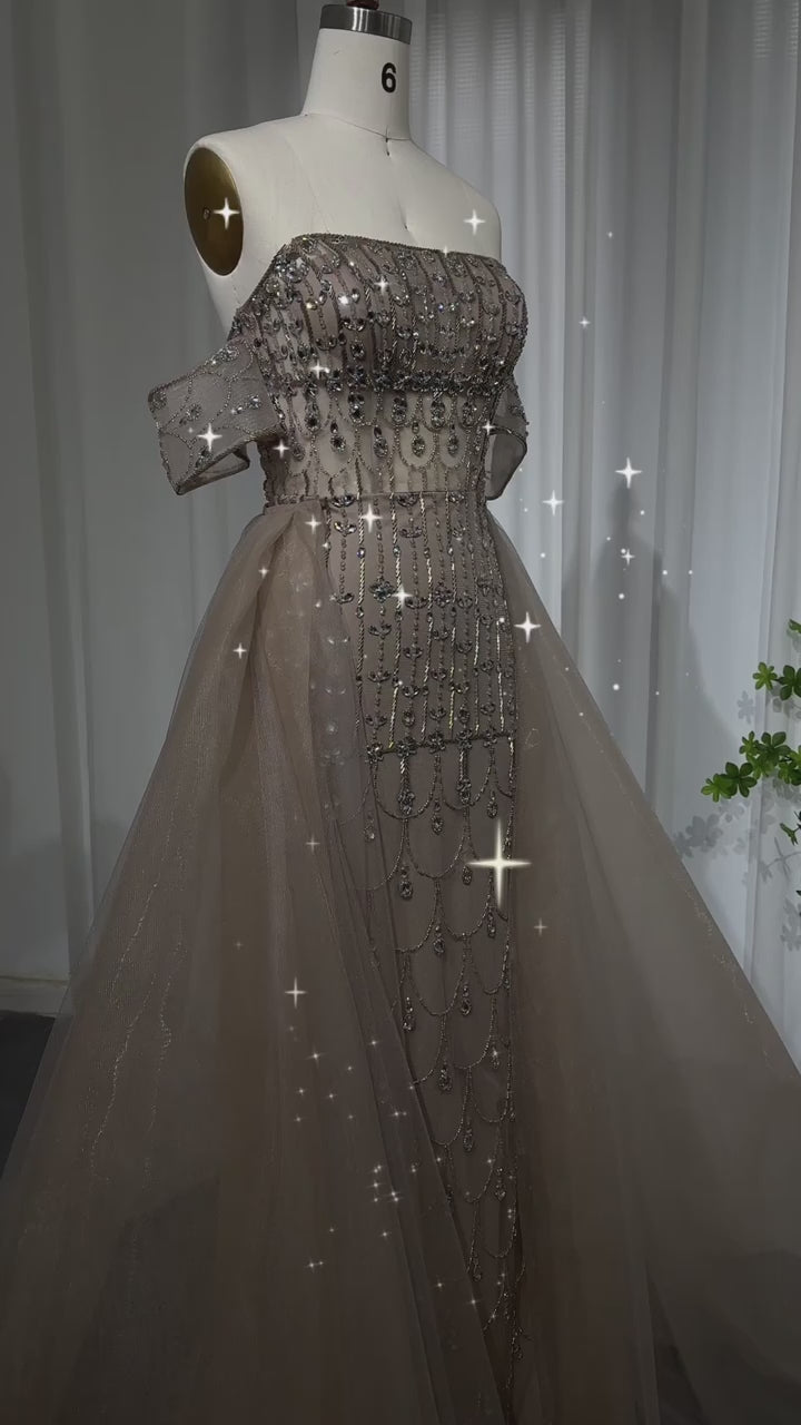 Luna gown is a timeless piece that showcases intricate crystal beadwork that flatters the body with subtle shine. The corset back sculpts the waist while providing a comfortable fit, and a soft detachable cape sleeves add a graceful, modern touch. Ideal for the woman who appreciate understated elegance with a hint of opulence.