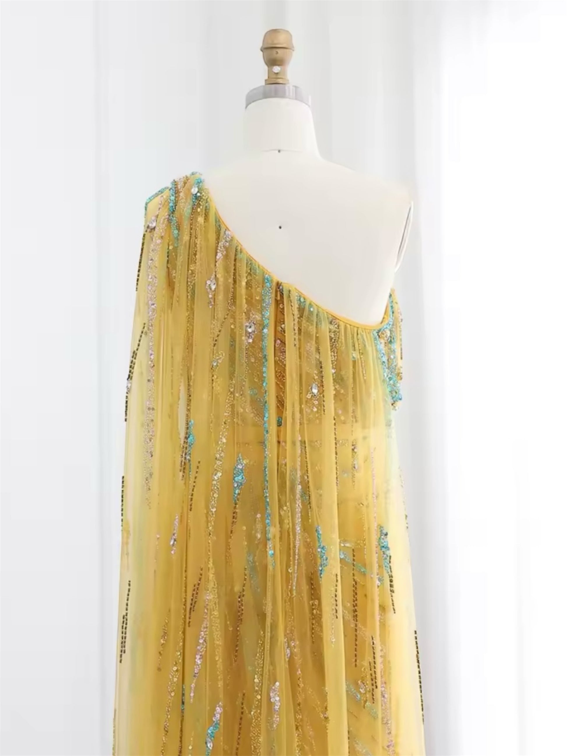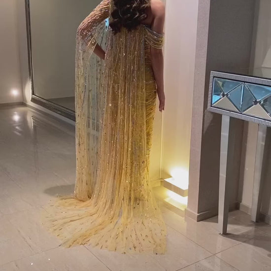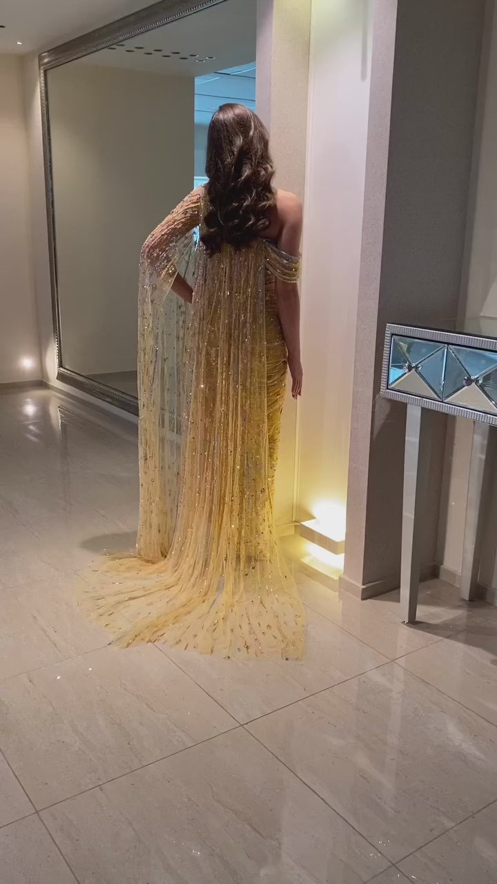 Bella gown, draped in luminous golden fabric and sprinkled with sparkling crystals, this gown flows effortlessly with every step. The sheer embellished cape lends a goddess like aura, making you the center of attention without trying too hard.
