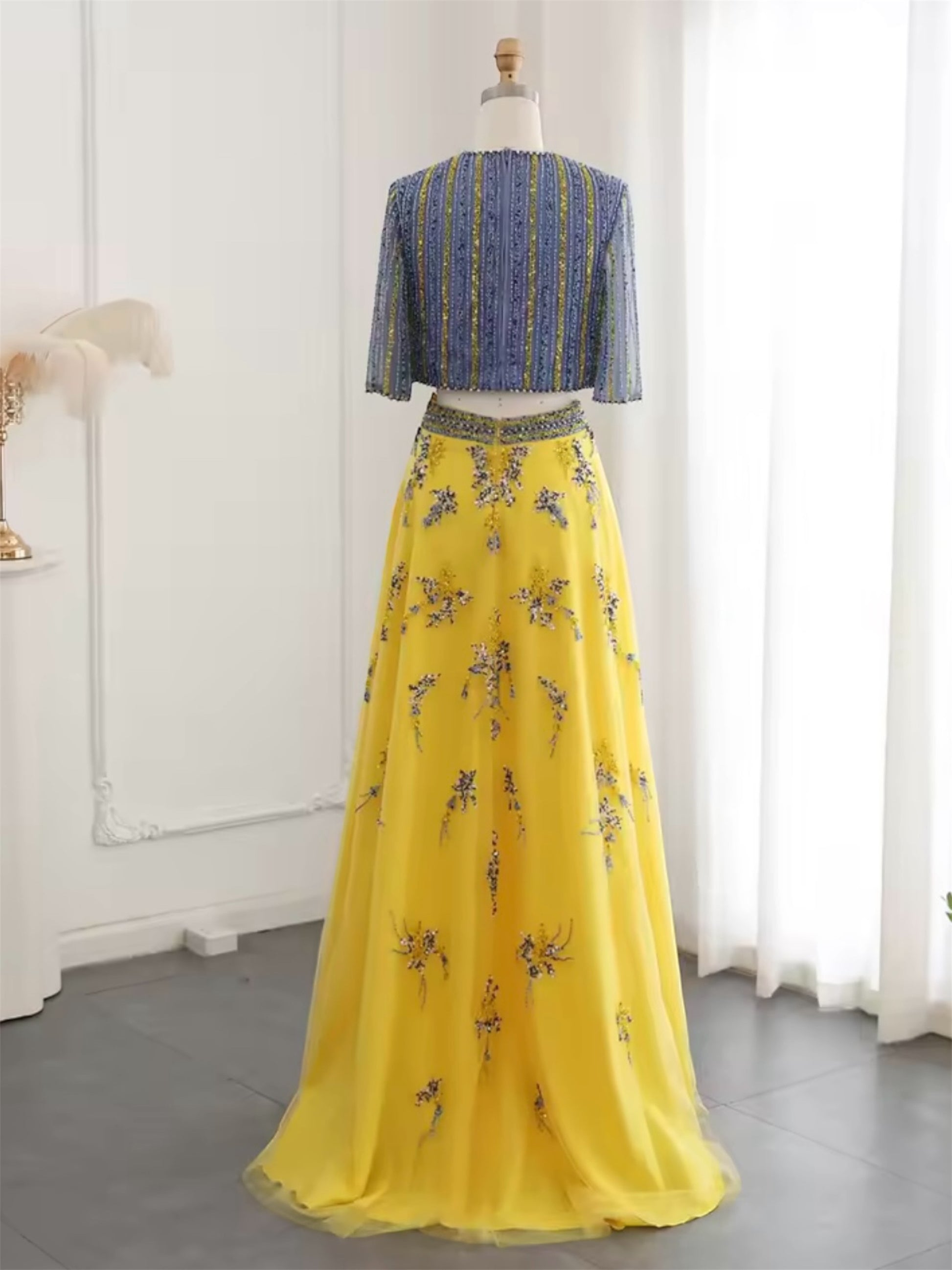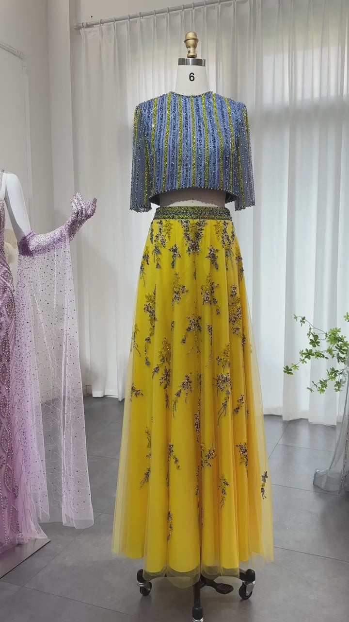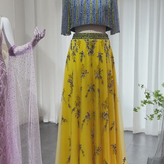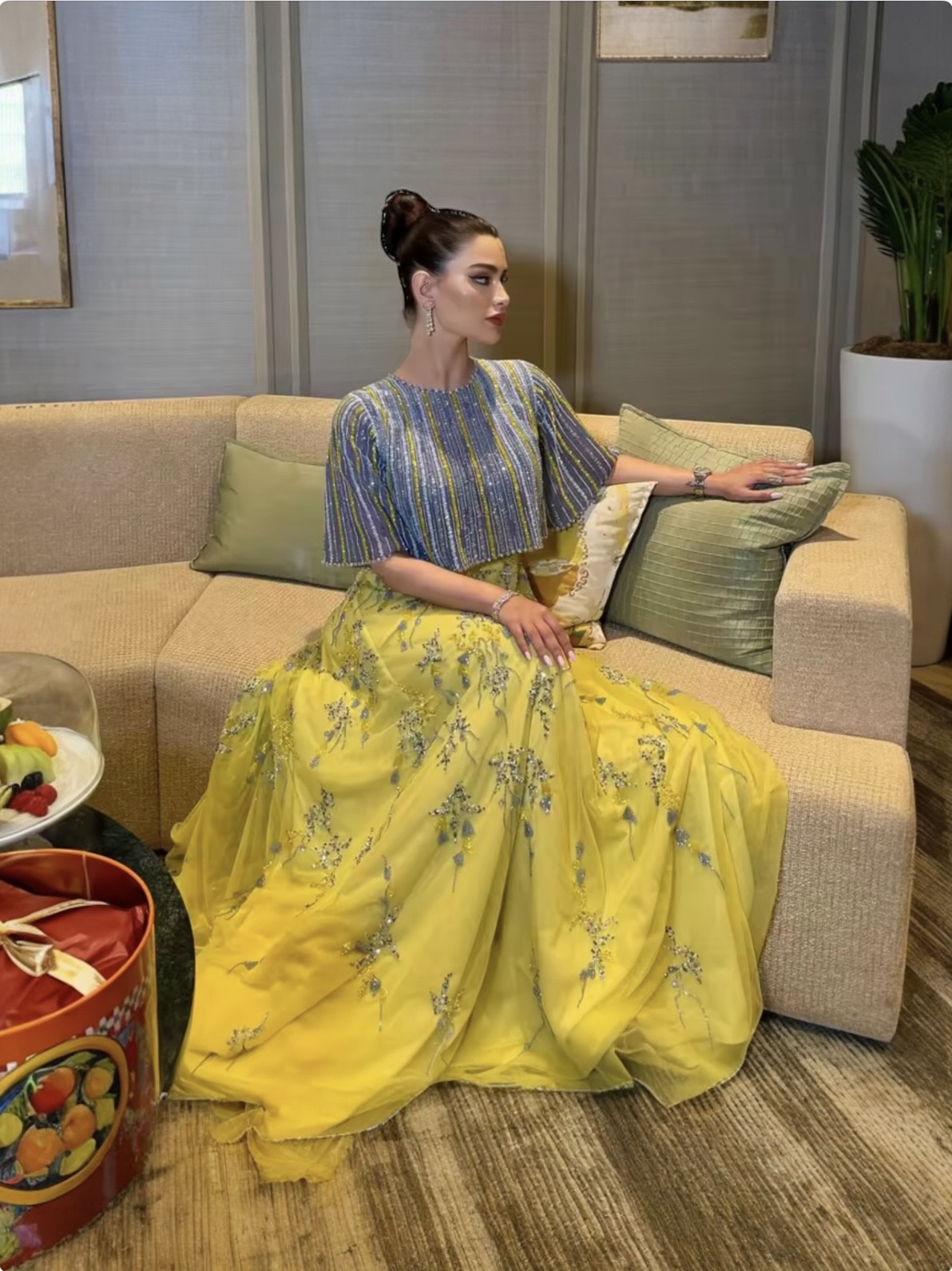 Radiance meets elegance in this sunshine yellow skirt set, Talin. Adorned with delicate embroidery that catches the light, the full flowing skirt adds drama, while the structured cropped blouse with cape style sleeves balances grace with modernity. A celebration of color and craftsmanship, this piece ensures you will be the center of every room you walk into.