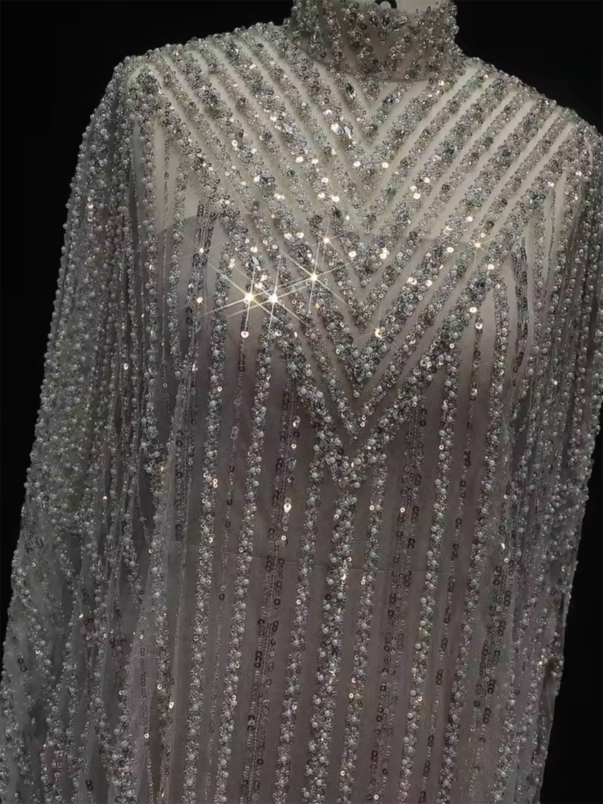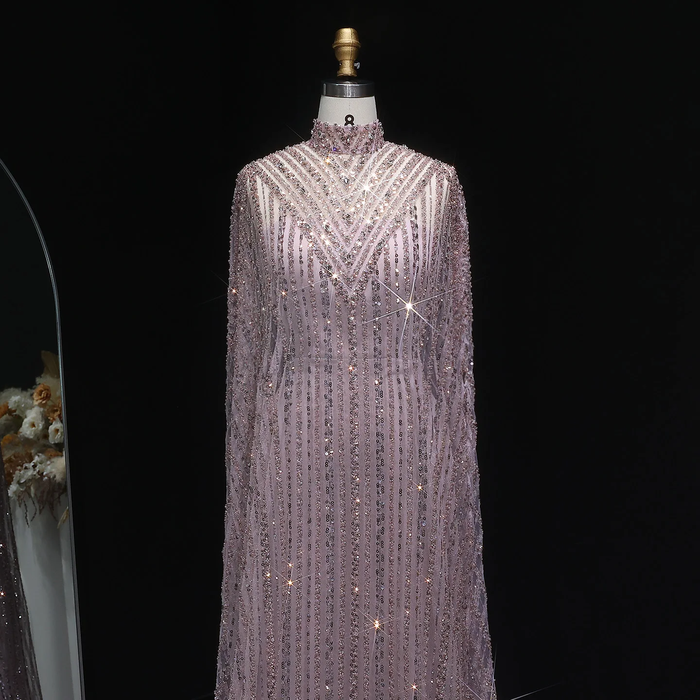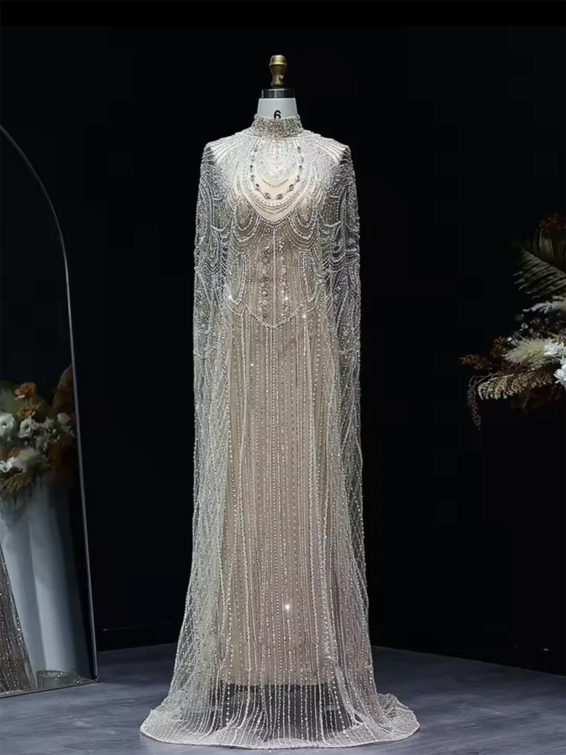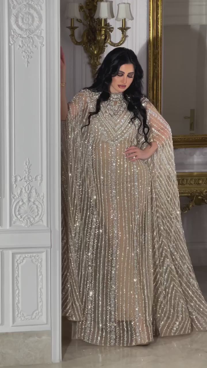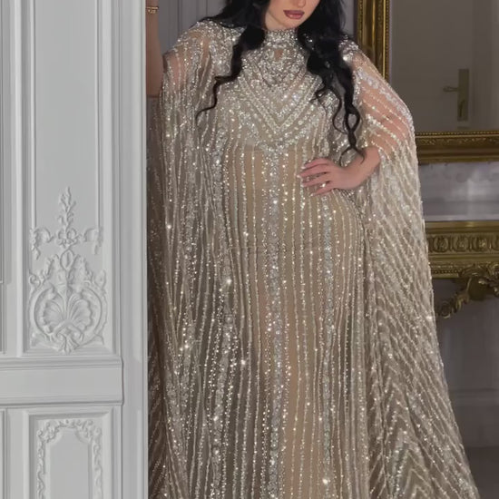 Amira kaftan abaya from our Kaftan Abaya collection is a flowing luxurious piece with cascading beadwork that glimmers like fine jewelry. Its soft flow and cape style cut make Amira a masterpiece of elegance and grace, perfect for the woman who love understated luxury.