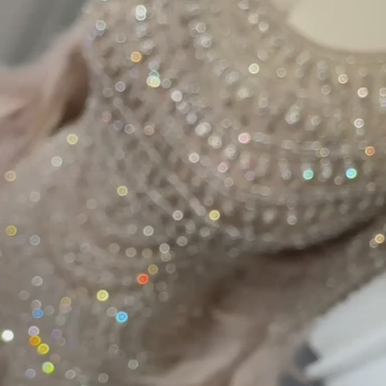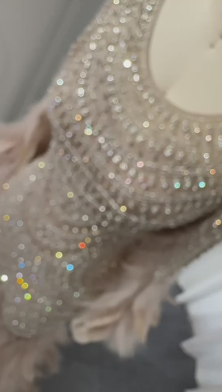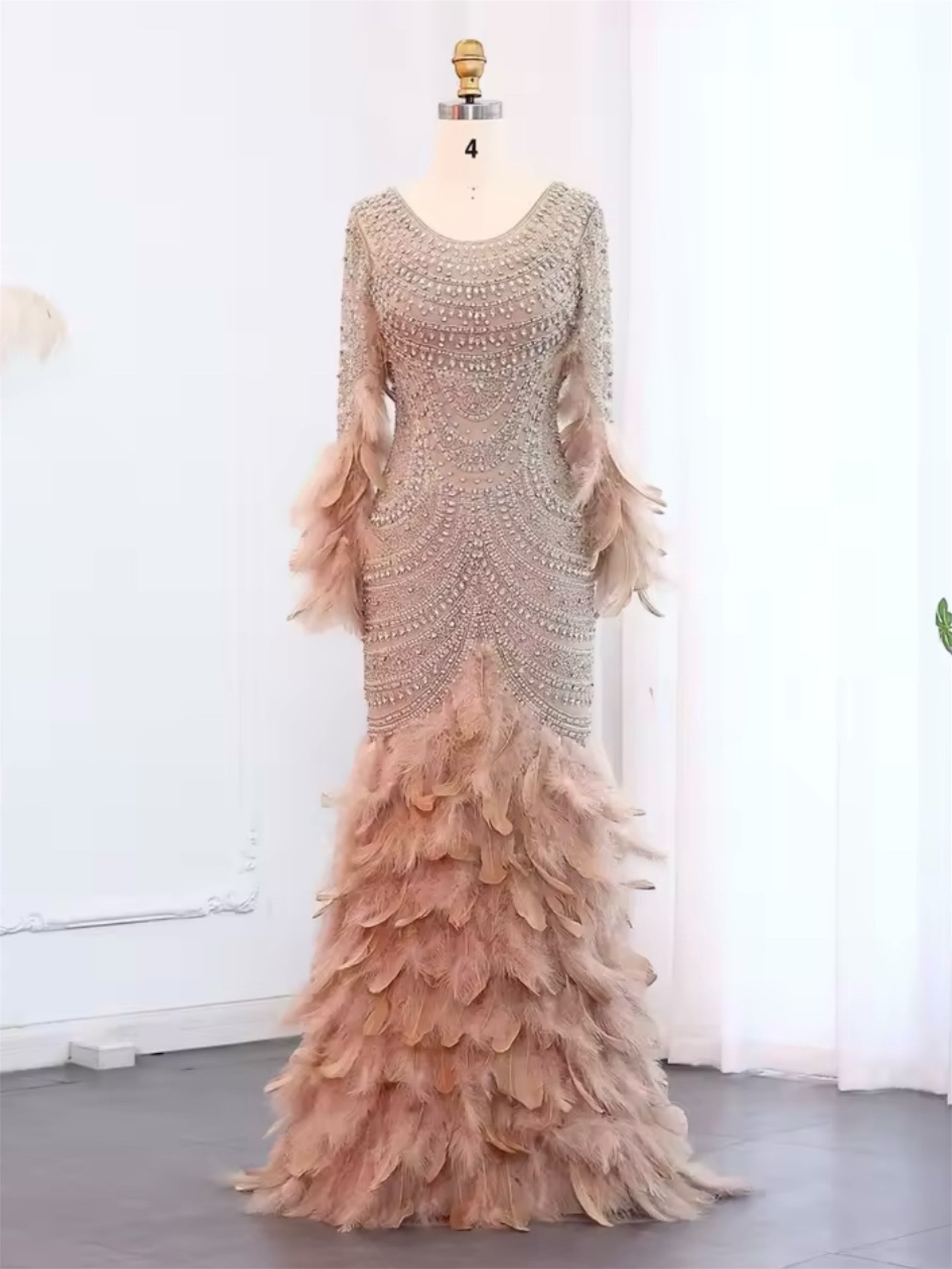 Delilah is a fitted gown that blends precision and flair with its beaded bodice and dramatic layered feather hem. The sheer long sleeves with feathered cuffs add softness while keeping arms covered. The beadwork elongates the figure and sparkles subtly under light. Ideal for the lady who want drama with refined detailing and full length impact.