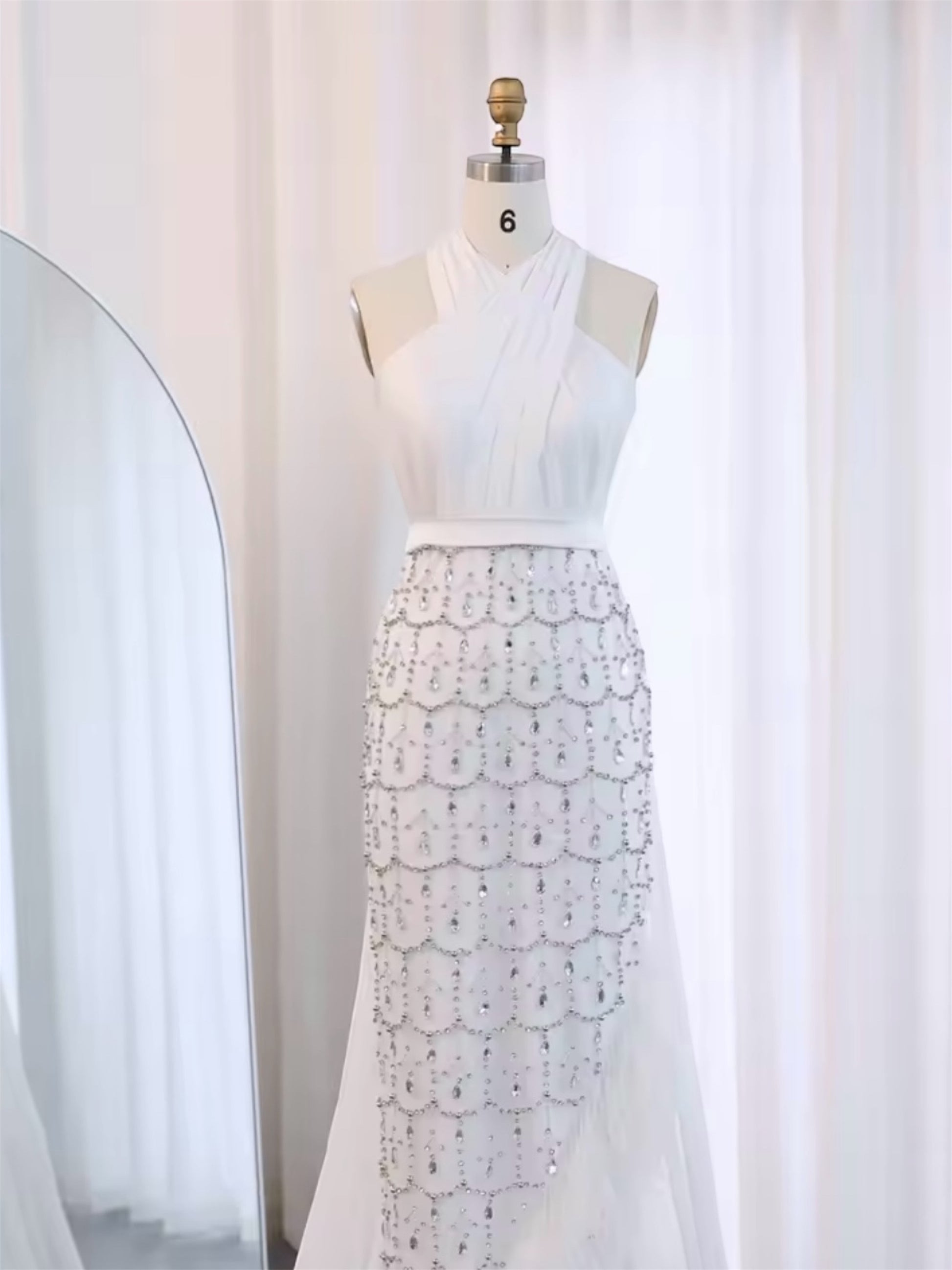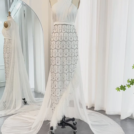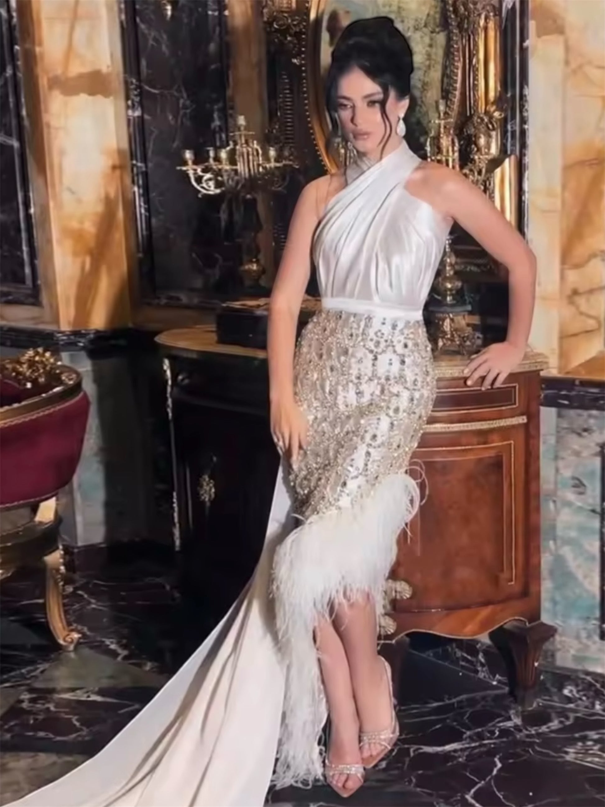 Gamila is a gown that features a sleek halter neckline that wraps elegantly around the shoulders, offering a modern take on classic sophistication. The bodice transitions into a fitted embellished skirt, finished with a front slit and feather trimmed hemline that adds movement and flair. The draped back panel creates a soft train effect for added drama. It's perfect for the women who wants bold lines, sensual detailing, and refined glamour in one look.