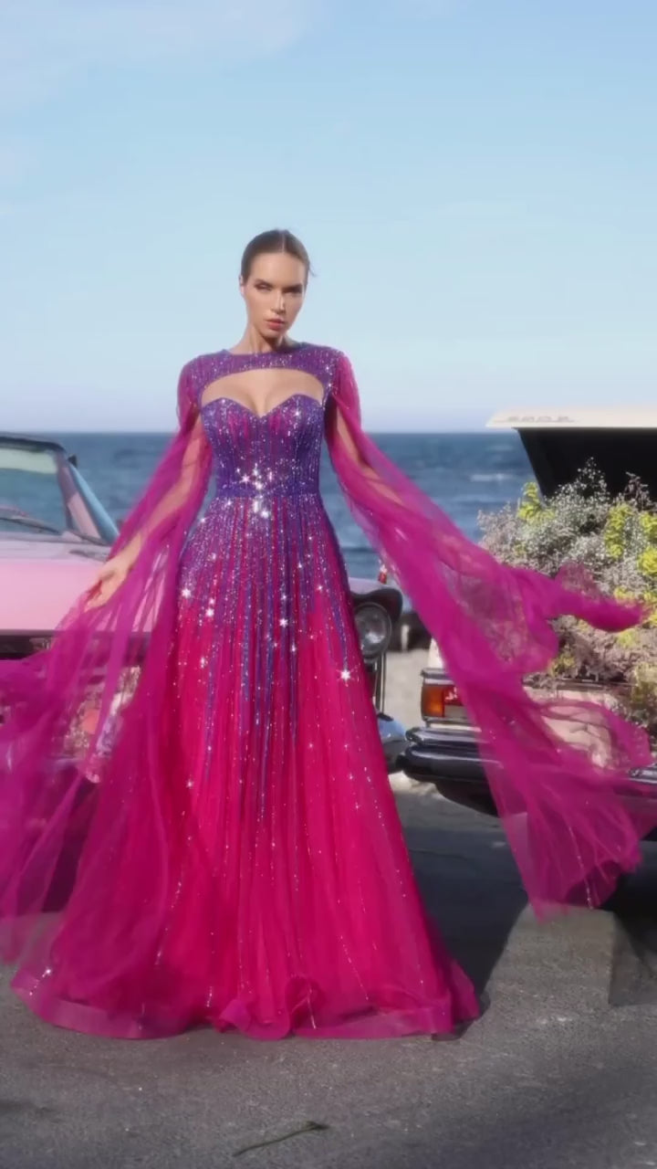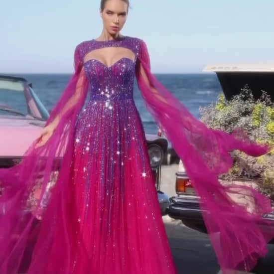 Twilight gown features a structured corset bodice with a heart shaped illusion neckline that lifts and defines the bust. The skirt is fully embellished with vertical beadwork to elongate the body, while the sheer cape sleeves add a regal touch without overpowering the silhouette. Fo the lady who want to stand out with confidence and sophistication.