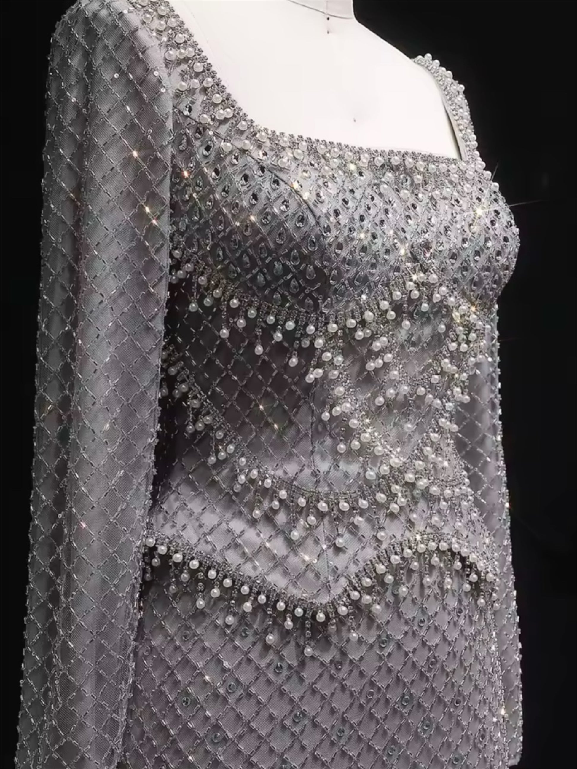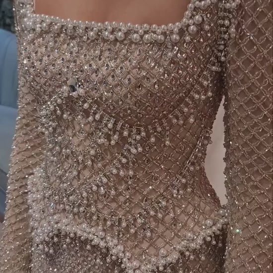 Ranya gown has a square neckline and intricate beadwork forming a sculpted silhouette. The detailing shimmers with every movement, showcasing precision workmanship and timeless elegance. Ranya is for the woman who loves grace withy a touch of strength.