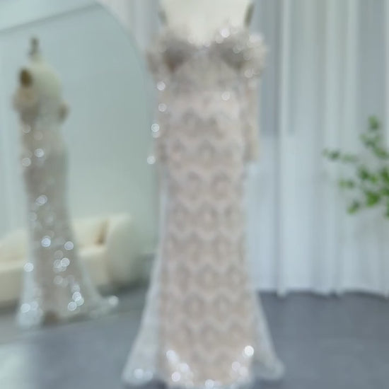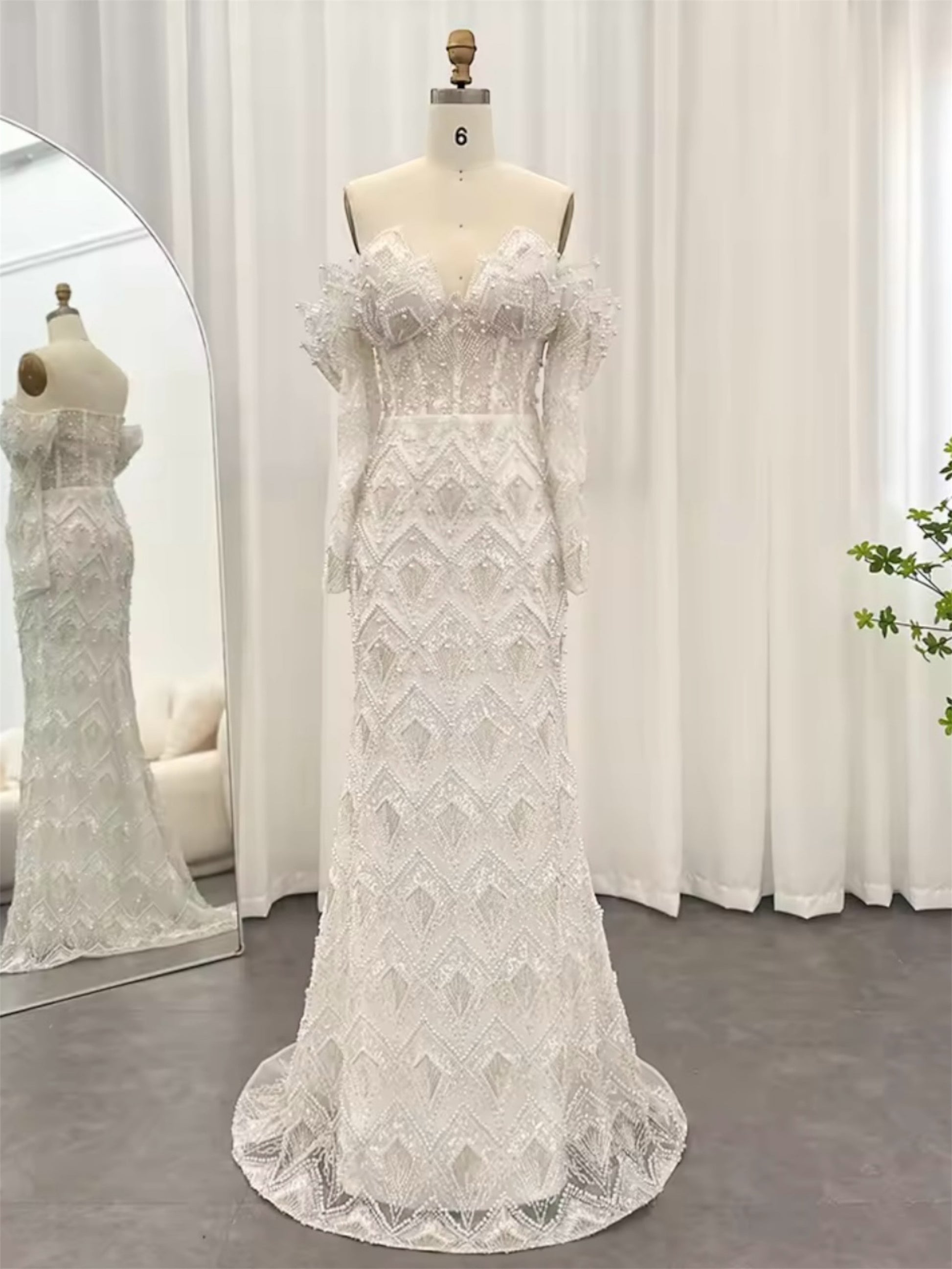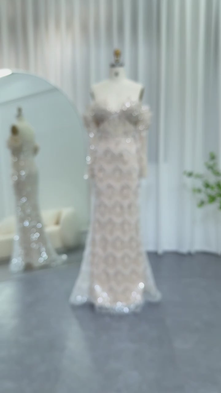 Bayanah gown is crafted in layered lace and beadwork, defining the body with structured paneling and a unique scalloped off shoulder neckline. The sheer long sleeves and contoured bodice enhance the silhouette while maintaining coverage. A gentle fishtail finish gives balance and grace. This is the gown for women who want both classic beauty and standout craftsmanship.
