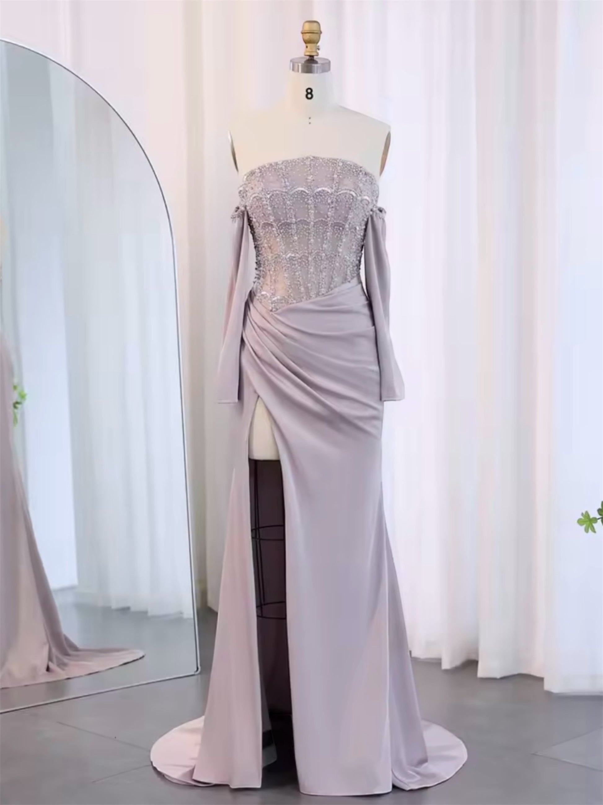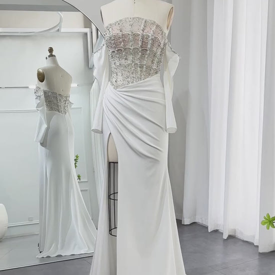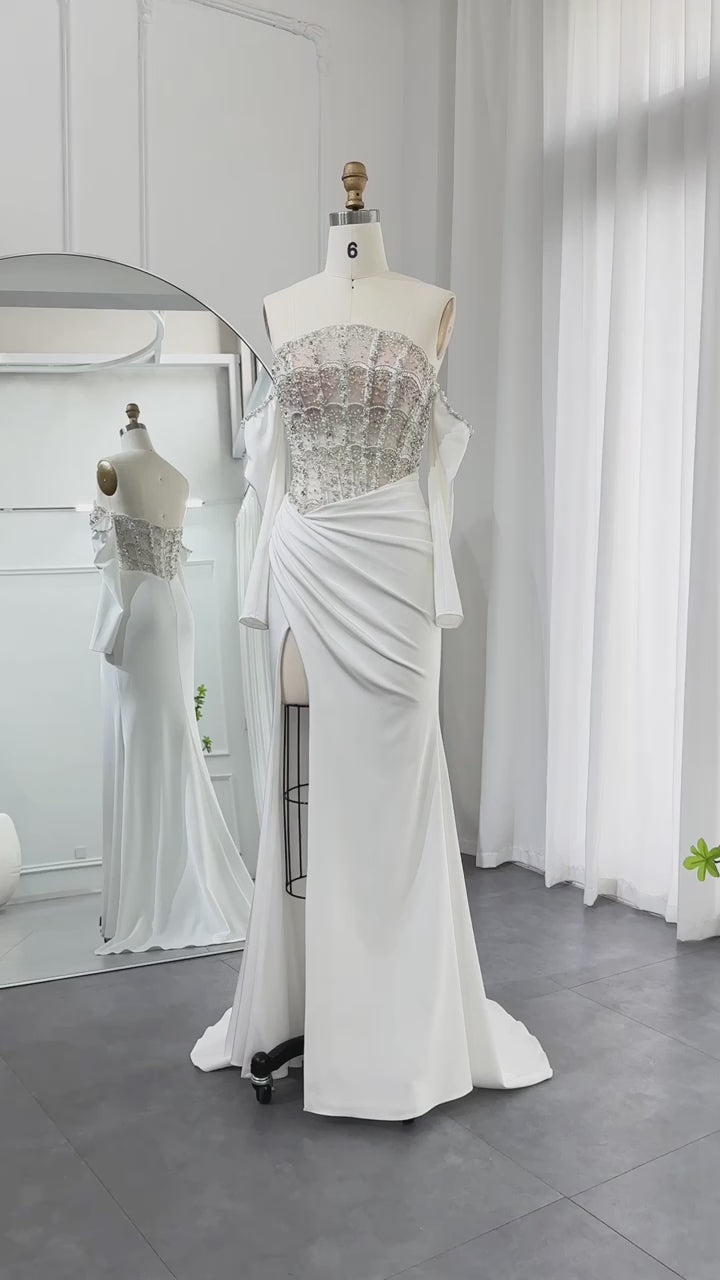 Candice is a sculpted gown that features a sheer corset bodice framed by long off shoulder sleeves and intricate crystal detailing. The draped hip panel cinches the waist and leads into a thigh high slit for added movement and bold structure. The look is finished with a clean back zip and tailored fit. A powerful and high fashion cut that flatters every curves.