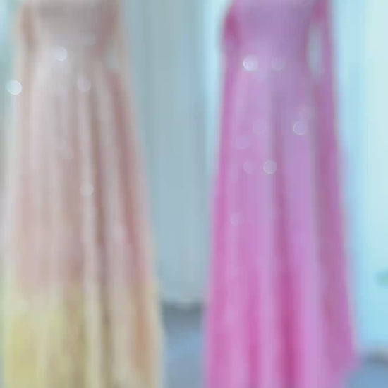 Hana gown is fully encrusted in sequins and beads, with a one sided neckline and sheer long sleeves that adds just the right amount of coverage. The hem is finished with a tier of tonal feathers that add lightness and fluidity as you walk. Ideal for women who want to soften the room with elegance while still catching every eye.