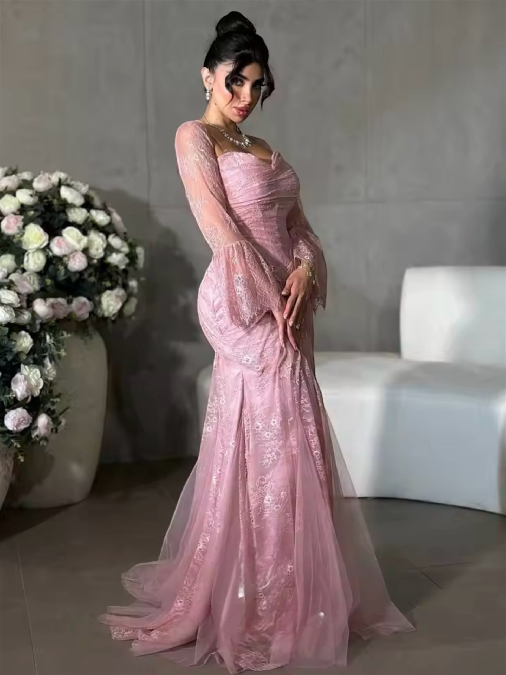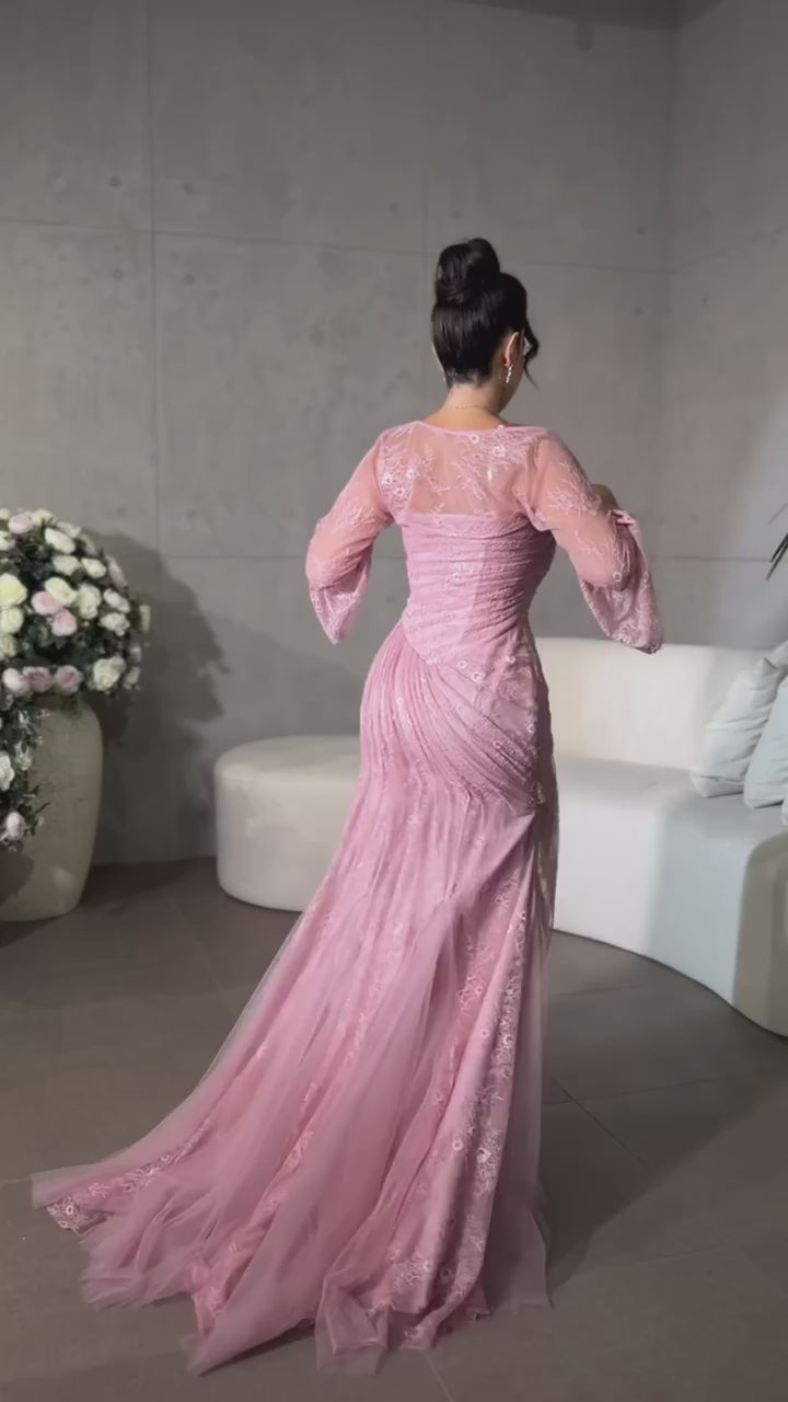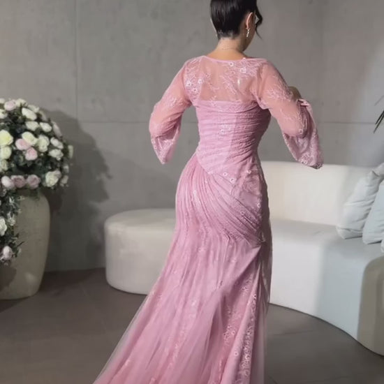 Mariam is a fitted gown that features flattering draped pleats defining the waist and hips. The sheer balloon sleeves add a soft finish, while the back is sculpted with a modest train that flows as you move. The gown hugs the body in all the right places. Perfect for the lady who want curve definition with soft femininity.