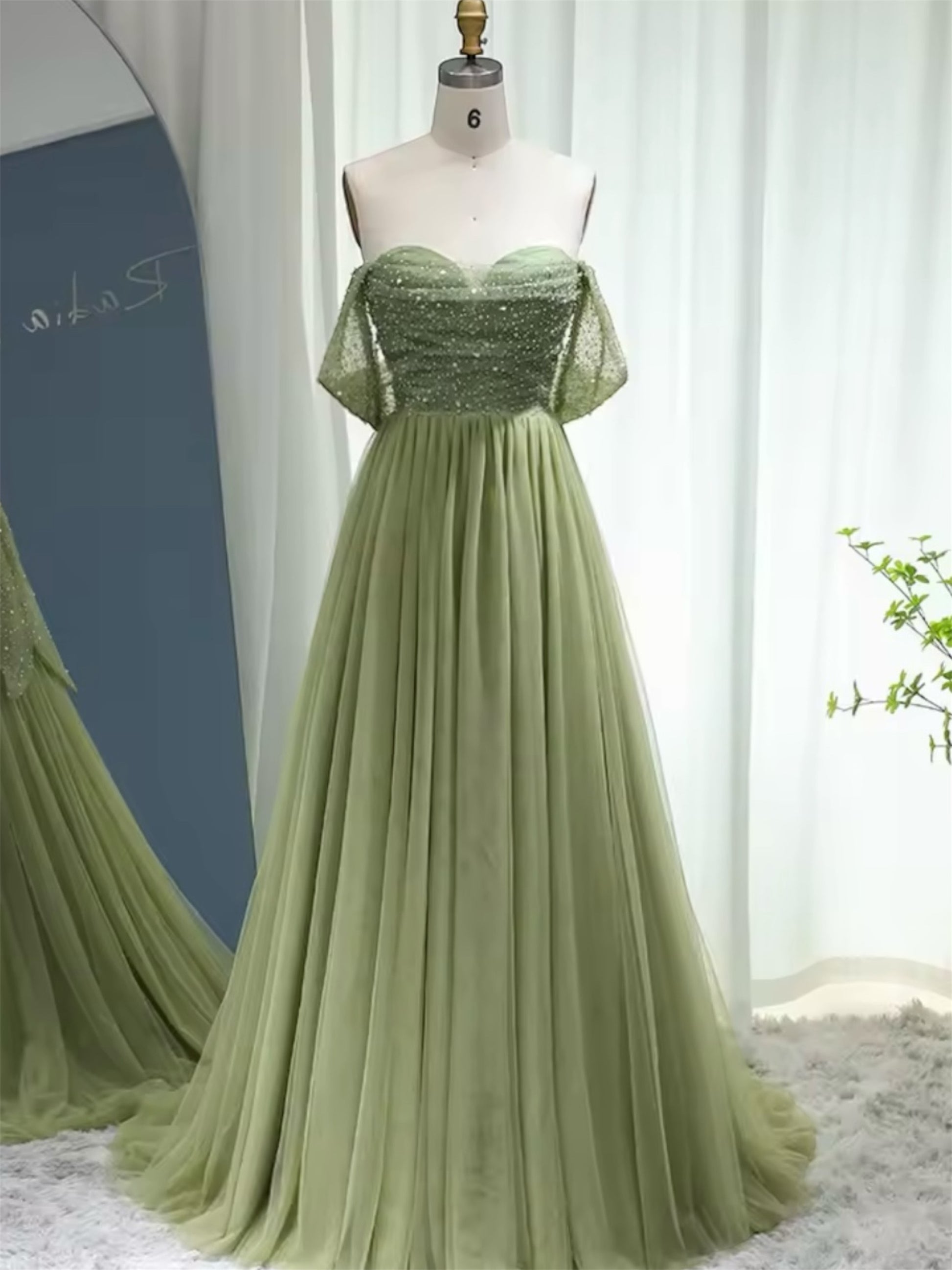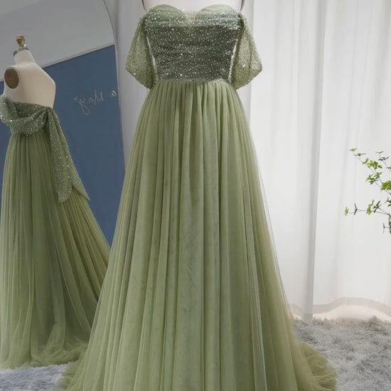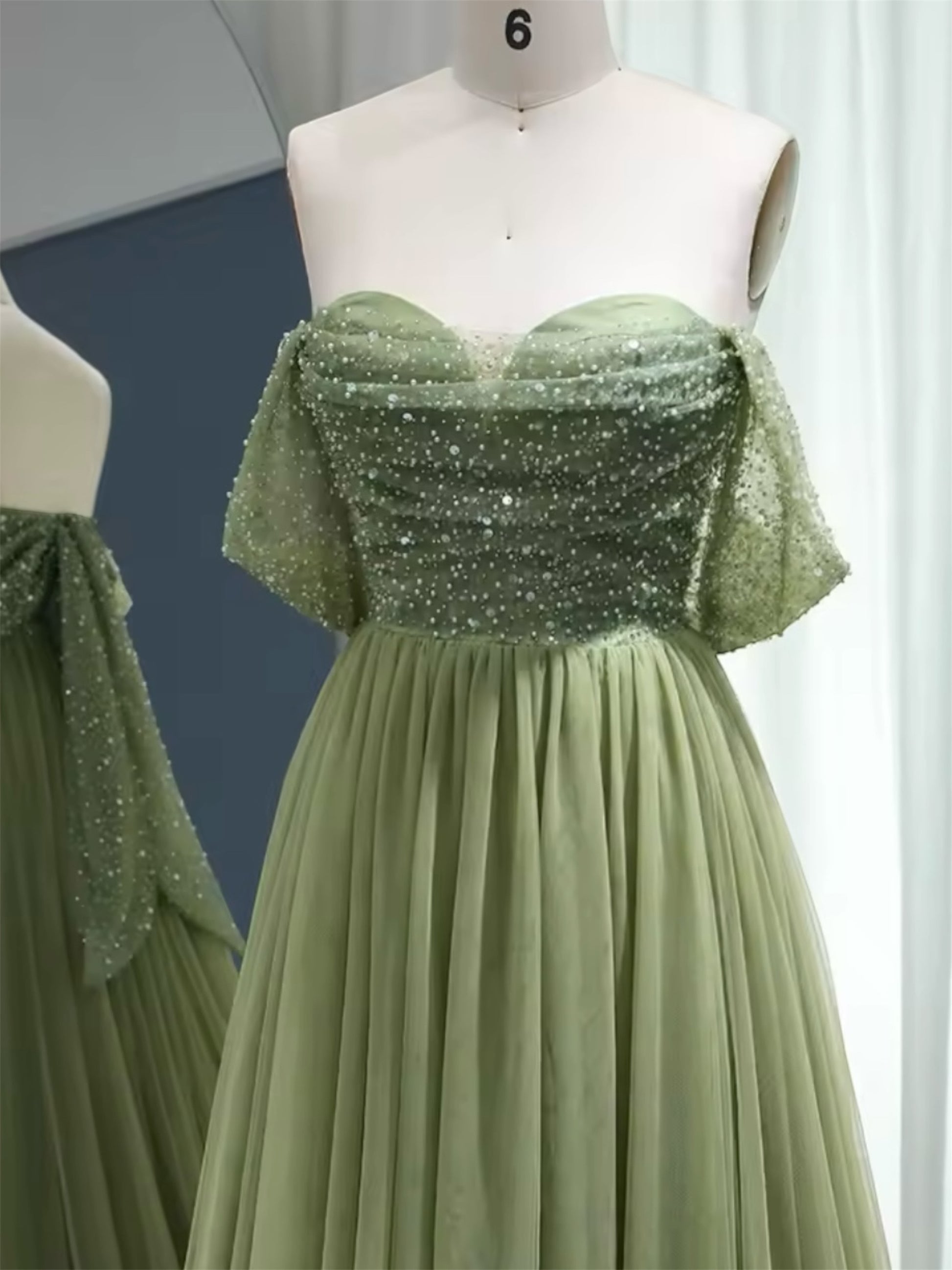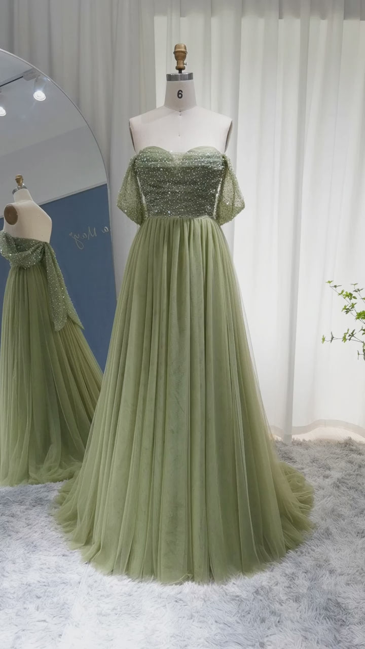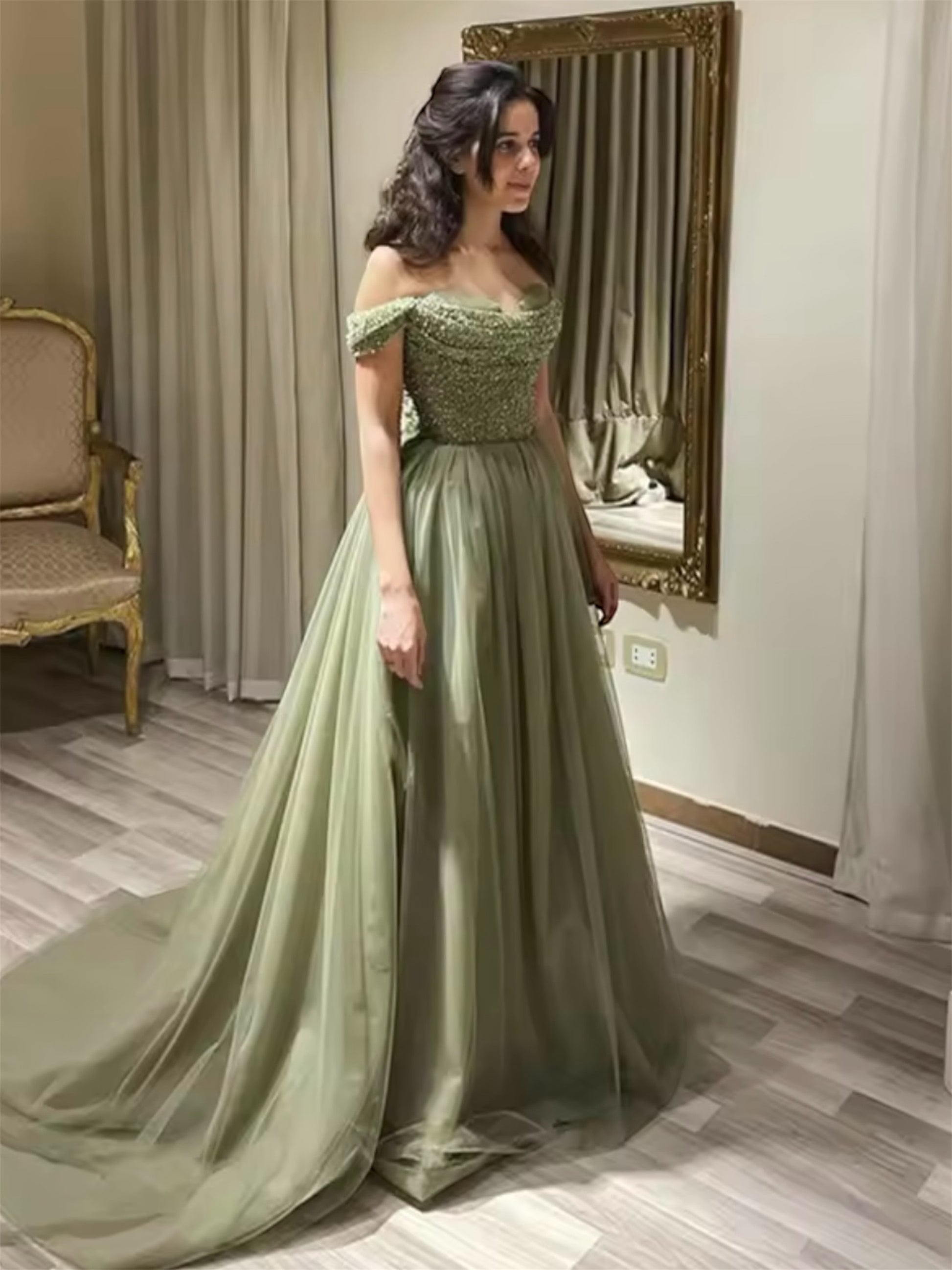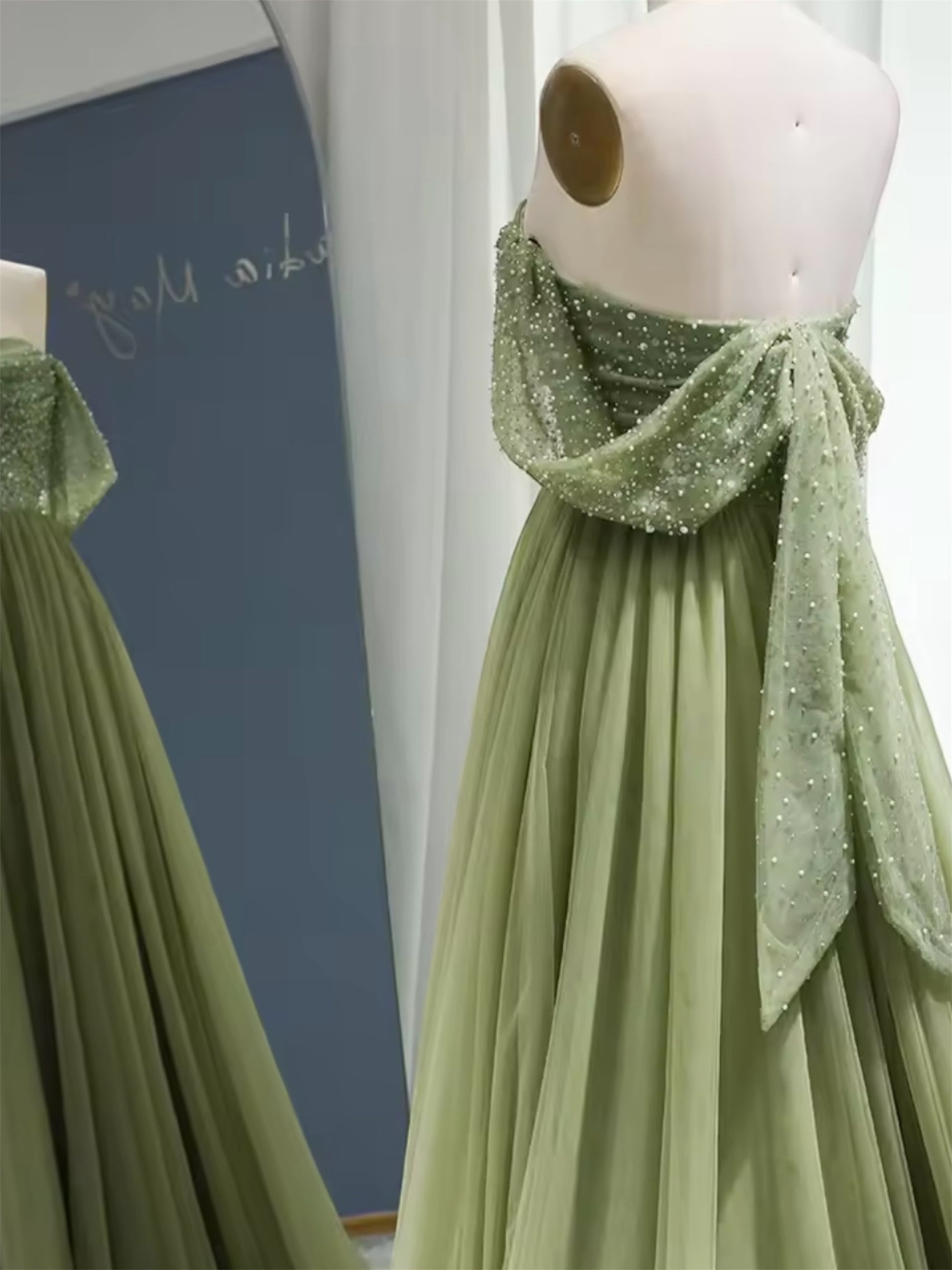 Dana is an elegant sage green gown that features a flattering off-shoulder neckline and a structured bodice that gives beautiful definition to the waist. The lightweight chiffon skirt flows effortlessly, adding grace to every step. At the back, a statement oversized bow adds a feminine touch, making this dress both refined and charming.