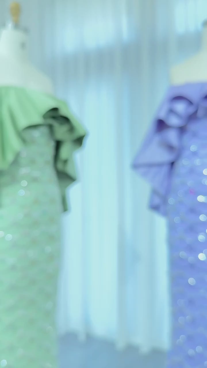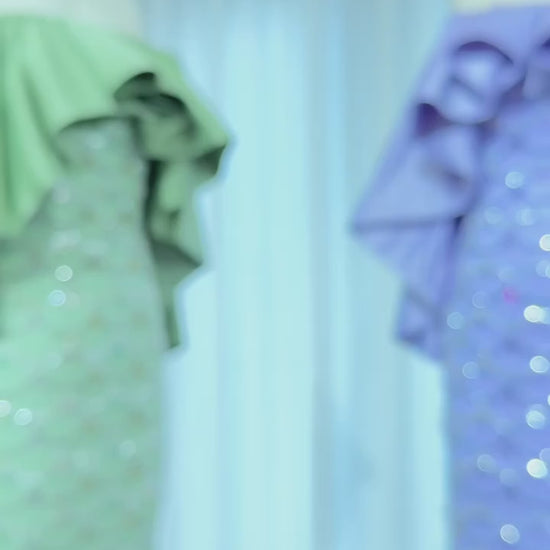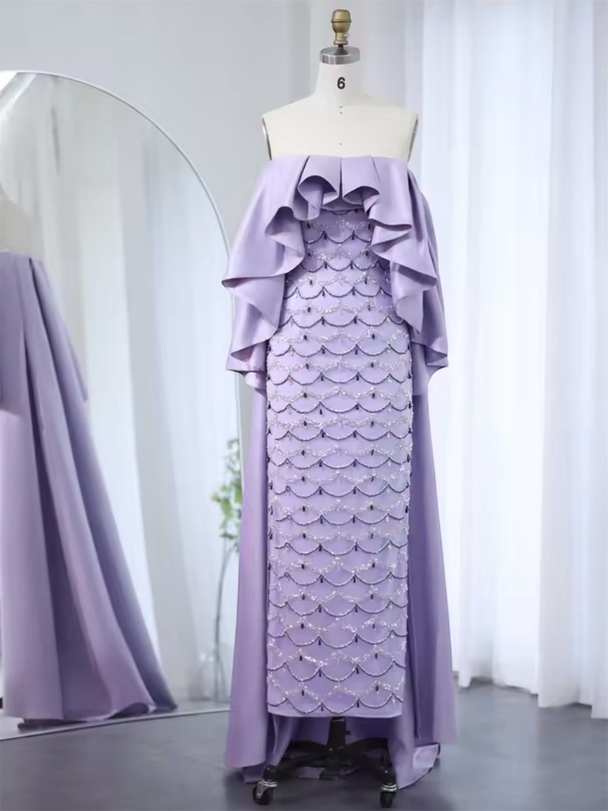 Nadira gown is designed to impress, the textured bodice features a scalloped pattern that subtly reflects light, while the tiered, sculpted cape drapes from the shoulders to the floor - creating a presence reminiscent of imperial grace. The off-shoulder neckline balances softness with strength. This is for women who want to own the room the second they walk in.