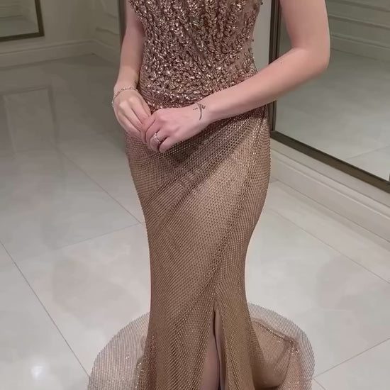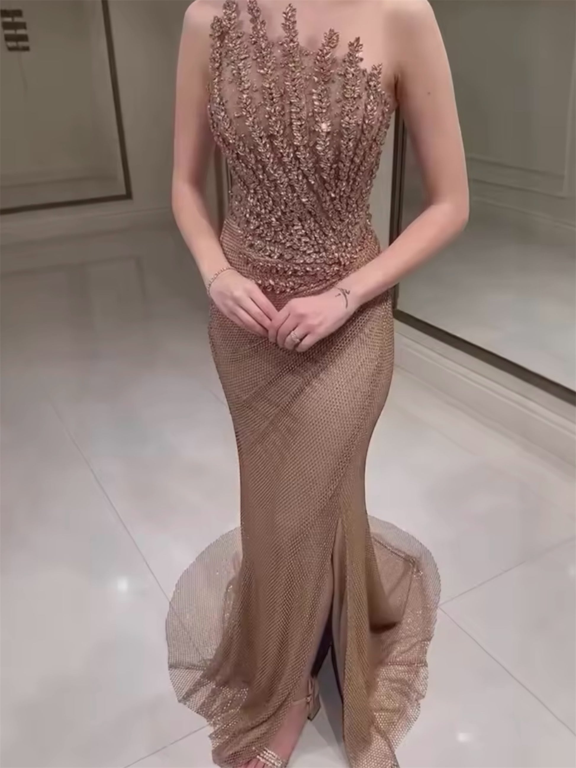 Arielle gown blends a mesh base with cascading hand-applied crystals, creating an ethereal illusion that hugs every curve. The beadwork gathers and elongates the silhouette, while the thigh high slit adds just the right amount of allure. It's a perfect marriage of elegance and seduction.