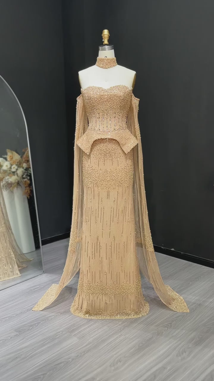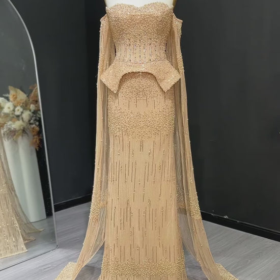 Nala features a sculpted , fully beaded corset that shapes the waist and frames the bust beautifully. The off shoulder neckline is paired with sheer draped sleeves that fall into a floor length cape, giving full coverage without losing elegance. For women who want a structured look with soft movement and couture finish.